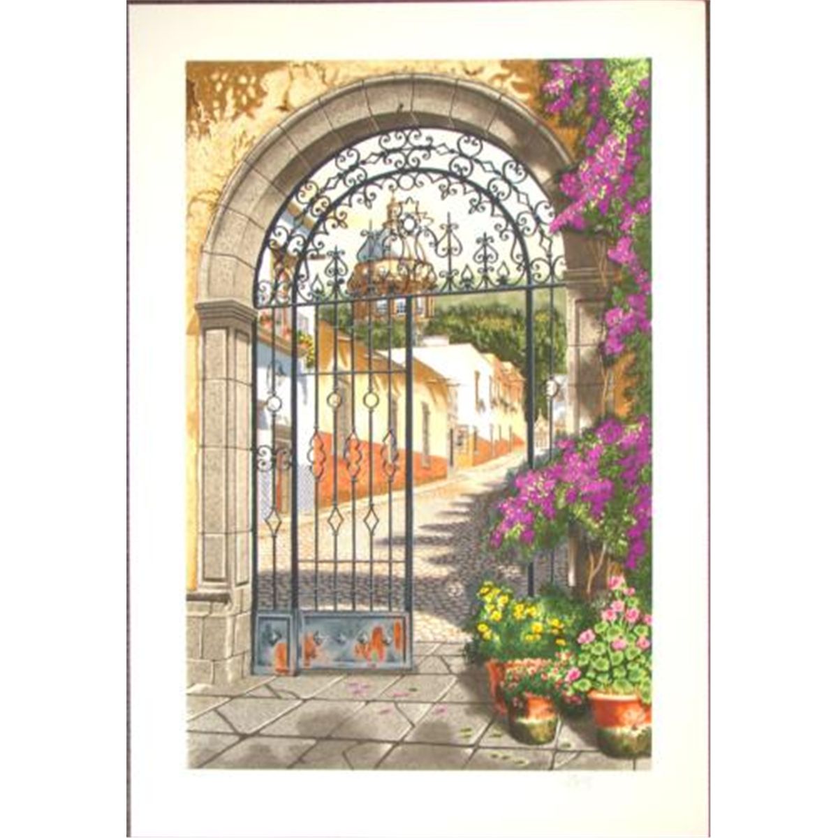 This stunning signed and numbered limited edition landscape print is by Juan Medina, an acclaimed and avidly collected artist: * Title: "Gateway to the Village" * Limited edition serigraph on paper * Signed and numbered from a limited edition of 300, plus 100 Roman and 50 APs * 21 × 32 inches * Excellent condition; never mounted, matted or framed * Certificate of Authenticity * Retail gallery price USD 1200 * * Born in Mexico, Juan Medina is fervently interested in maintaining his country s heritage and traditions. The majestic fountains, colorful church domes, solitary courtyards and the countryside of Mexico all serve as inspiration for Medina. He captures his subjects through a mastery of color and shadows and lanterns, tiles, trees and a feast of bougainvillea are set ablaze with light. "My intention," says Medina, "is to put down reality as I see it and the way most people would like to see their reality.