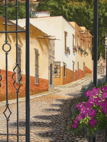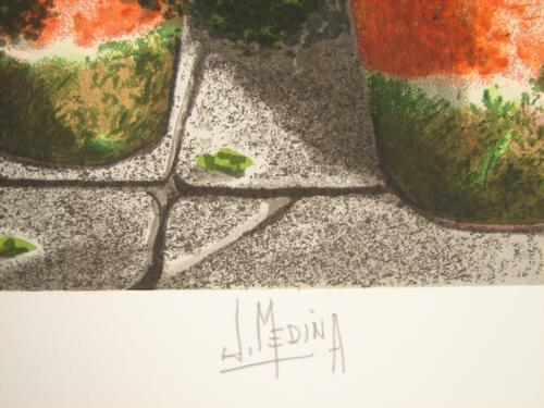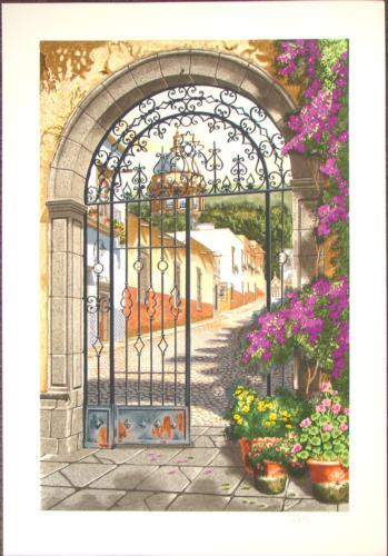 Born in Mexico, Juan Medina is fervently interested in maintaining his country s heritage and traditions. The majestic fountains, colorful church domes, solitary courtyards and the countryside of Mexico all serve as inspiration for Medina. He captures his subjects through a mastery of color and shadows and lanterns, tiles, trees and a feast of bougainvillea are set ablaze with light. "My intention," says Medina, "is to put down reality as I see it and the way most people would like to see their reality.