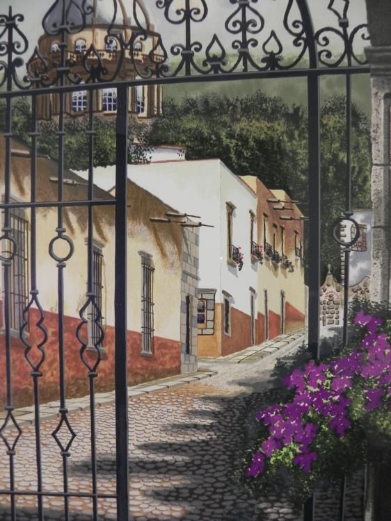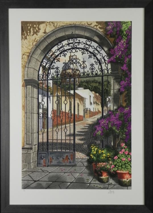 Viewing this picture is like walking up to a charming old gate to enter a wonderful old world village. * * * * Artist: Juan Medina * Signature: In pencil, lower right * Title: "Gateway to the Village" * Medium: Serigraph on paper * Edition: Numbered XV/C * Publisher: Kato Art Studio, California- blind stamp, lower left * Image size: 21 x 32 inches * Framing: In matte black wood grain frame * Frame size: 28 7/8 x 40 1/2 inches * Condition: Excellent * Biography: * * Born in Mexico, Juan Medina (1950- ) is fervently interested in maintaining his country's heritage and traditions. The majestic fountains, colorful church domes, solitary courtyards and the countryside of Mexico all serve as inspiration for Medina. He captures his subjects through a mastery of color and shadows and lanterns, tiles, trees and a feast of bougainvillea are set ablaze with light. *