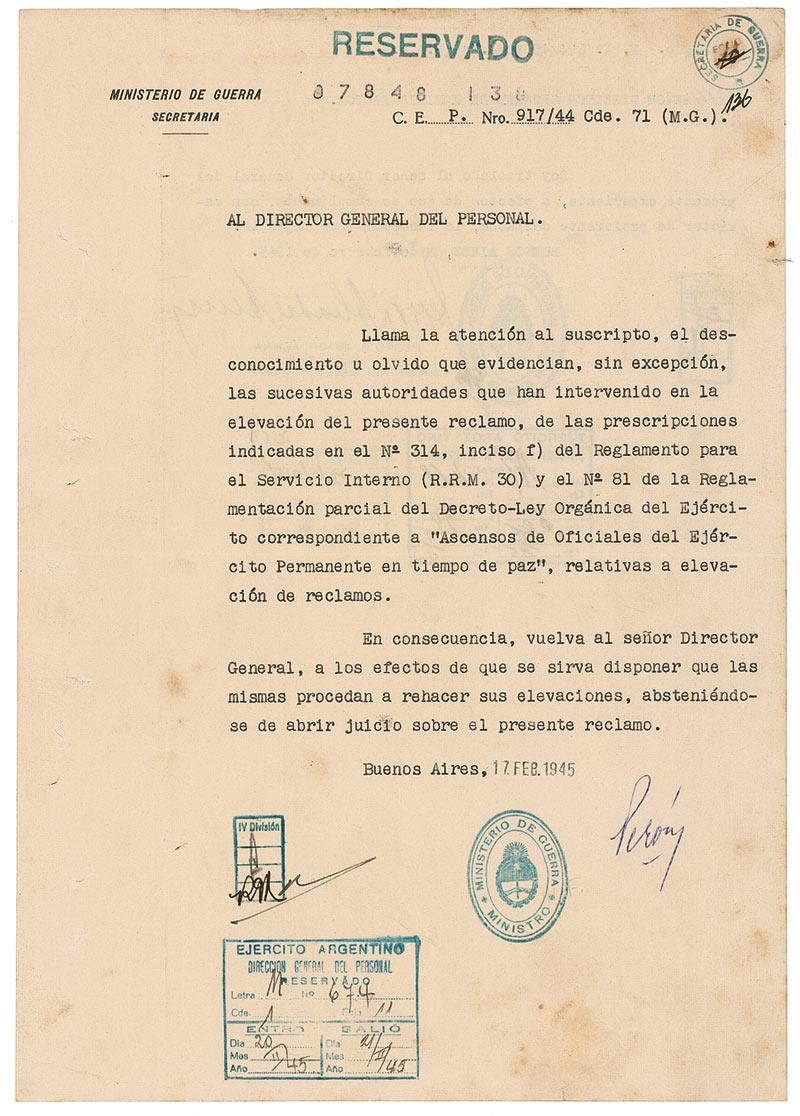 TLS in Spanish, signed “Perón,” one page both sides, 9 x 12.75, Ministerio de Guerra letterhead, February 17, 1945. Letter to General Pedro Abadie Acuna, Director of Personnel, calling his attention to the fact that “successive (military) authorities have, without exception, shown indifference or neglect” to complaints concerning “promotions of Officers of the Regular Army in time of peace.” He asks that General Acuna proceeds to re-examine those promotions in view of the existing regulations without making any judgment. Acuna has signed the reverse stating he will give the matter preferential treatment. In very good condition, with scattered toning and foxing, binding holes to left edge, and several office stamps and notations. Perón had many enemies in the Argentine military, and questioning promotions was probably one reason why. A military junta would arrest Perón in October of 1945. RRAuction COA.