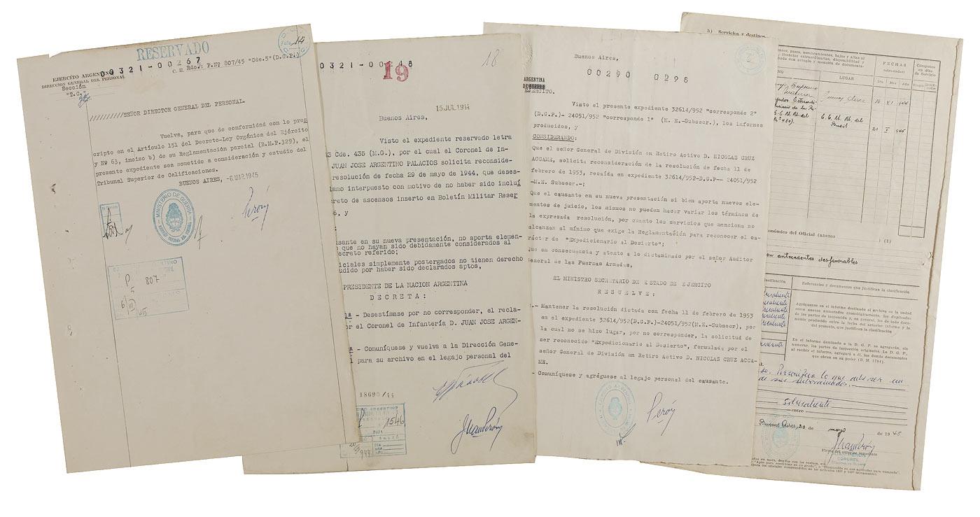 Four DSs, in Spanish, each one page, approximately 9 x 12.5, three from the 1940s and one from the 1950s. Untranslated official documents, two signed “Juan Peron” and two signed “Peron.” In overall very good, with scattered light creasing, soiling, wrinkling, handling wear, official stamps and notations, and binding holes to the left edge.