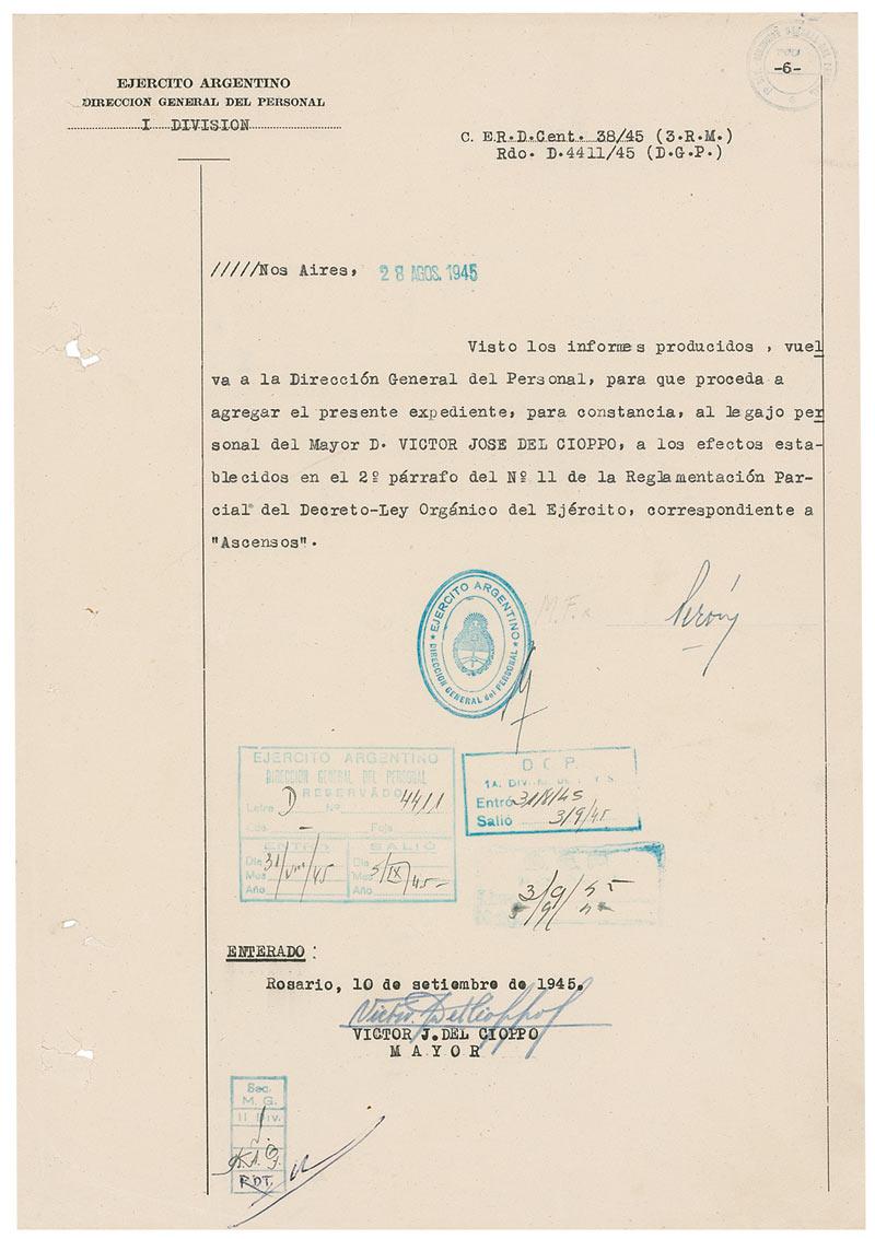 President of Argentina (born 1895) from 1946 to 1955 and again from 1973 to his death in 1974. DS, in Spanish, signed “Peron,” one page, 9 x 12.5, September 10, 1945. Untranslated official document, signed at the conclusion by Peron. Expected stamps and notations, punch holes and tears to left side, and scattered creasing, otherwise very good condition.