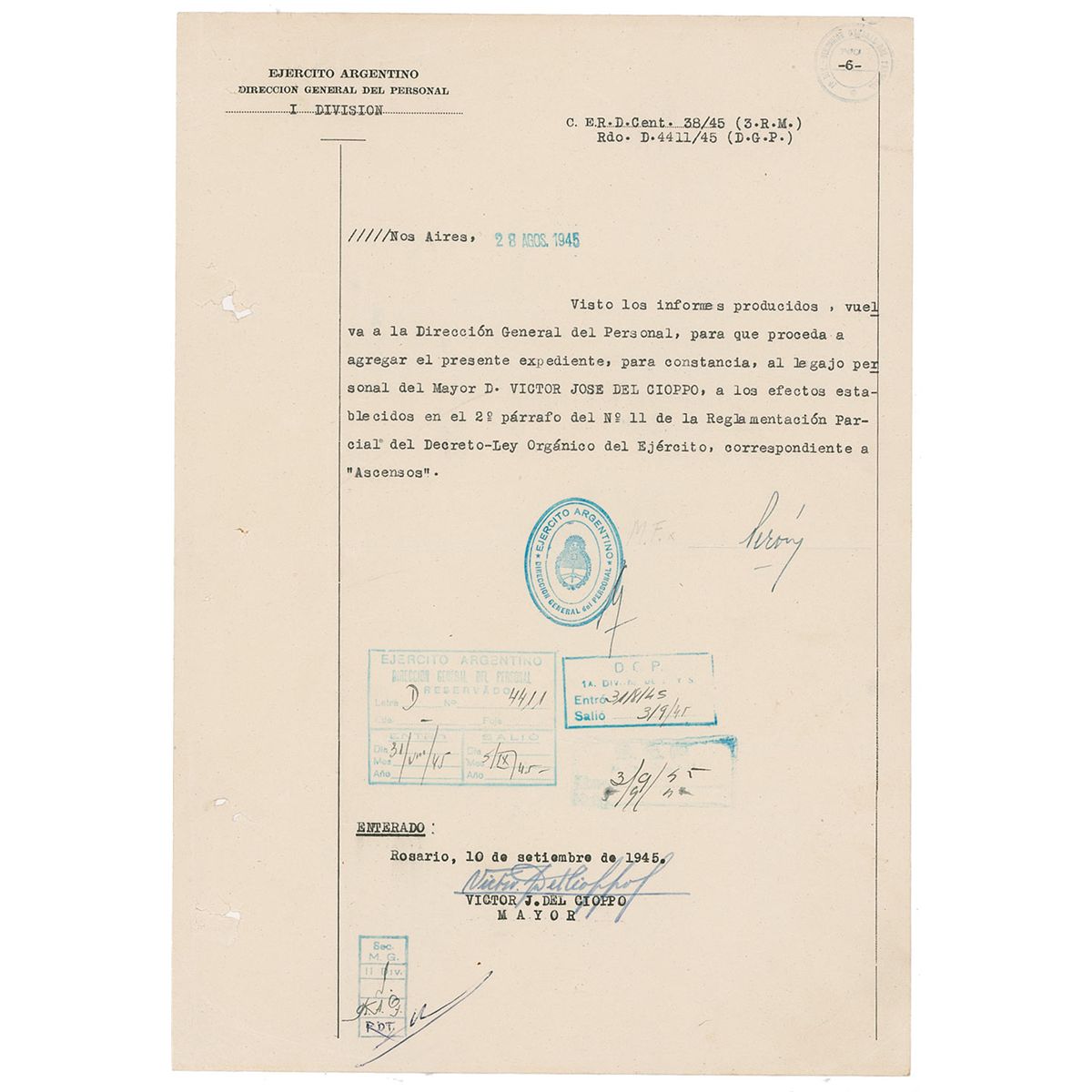 DS, in Spanish, signed “Peron,” one page, 9 x 12.5, September 10, 1945. Untranslated official document, signed at the conclusion by Peron. Expected stamps and notations, punch holes and tears to left side, and scattered creasing, otherwise very good condition.