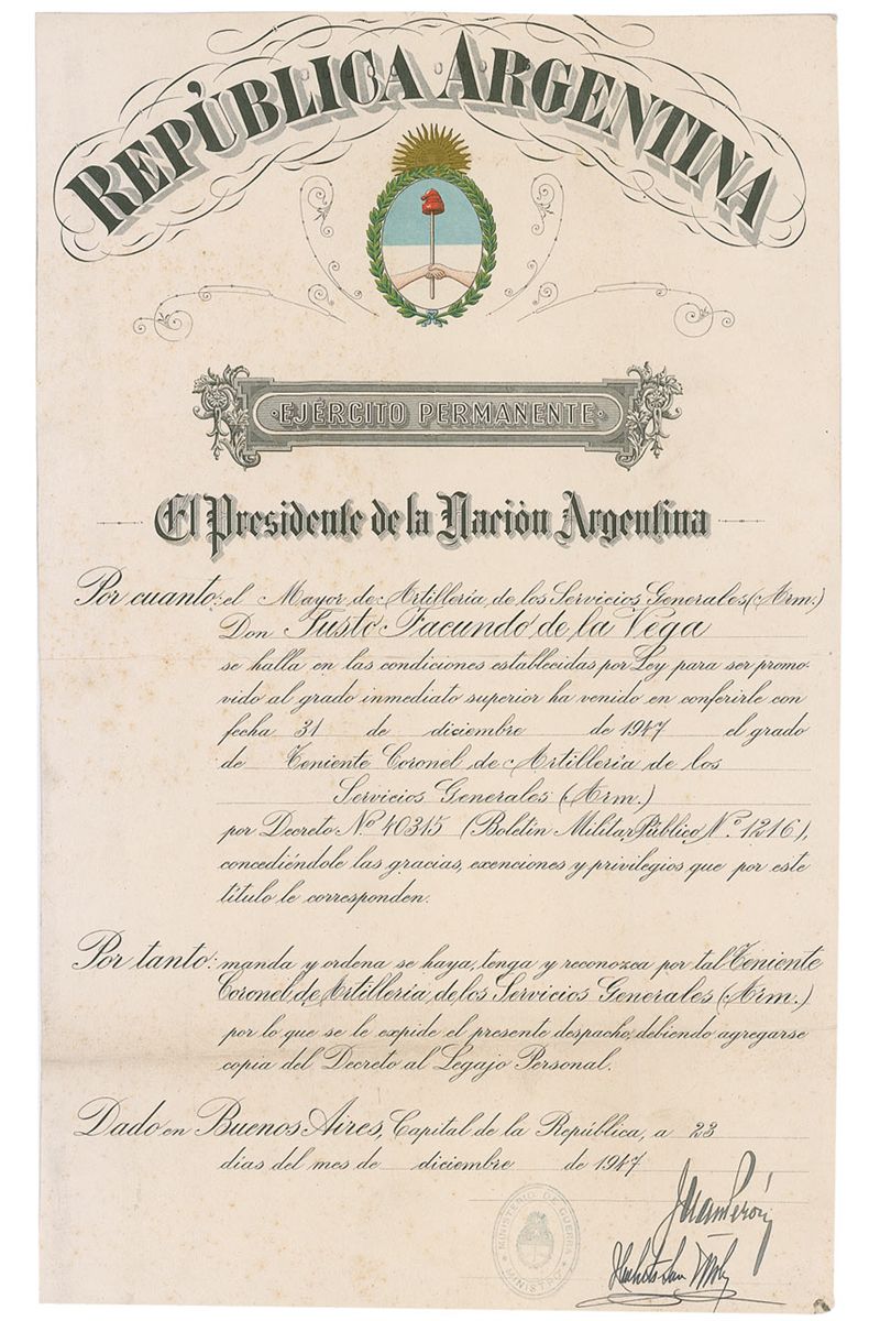 Partly-printed DS, in Spanish, one page, 10.25 x 16.5, December 23, 1947. A colorful official untranslated proclamation, boldly signed at the conclusion by Peron. In very good condition, with intersecting folds, trimmed edges, and some scattered light toning and foxing.