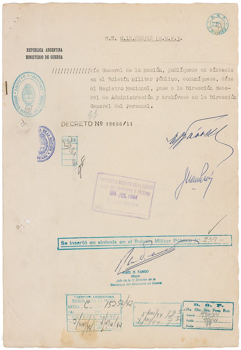 DS, in Spanish, two pages, 8.75 x 13, July 20, 1944. Untranslated two-page official document, signed on the second page in blue ballpoint. In very good condition, with rusty staples and holes to left edge, several punch holes, uniform toning, and some scattered light creases.