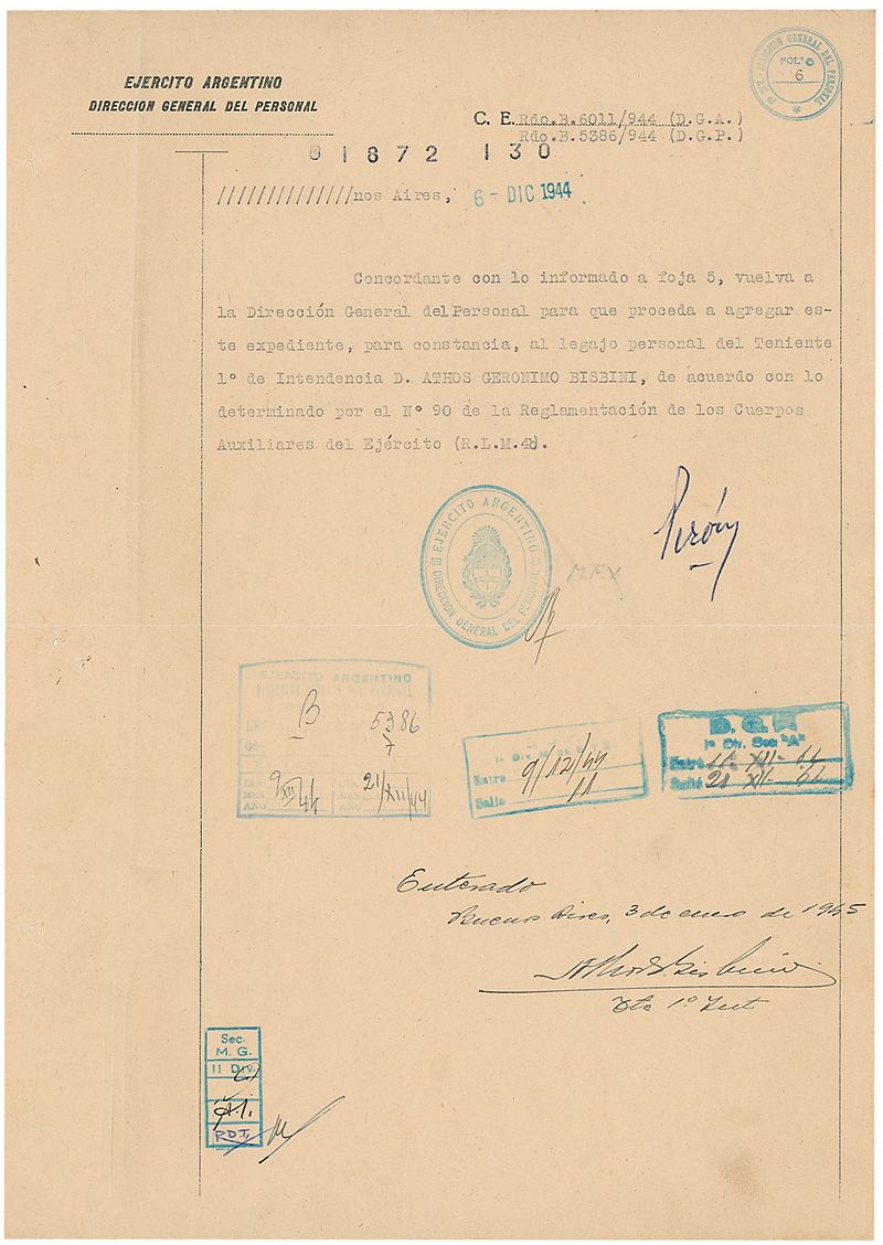 DS, in Spanish, signed “Peron,” one page, 9 x 12.5, December 9, 1944. Untranslated document boldly signed at the conclusion by Peron. Central horizontal fold, binder holes and vertical crease to left edge and expected stamps and notations, otherwise fine condition.