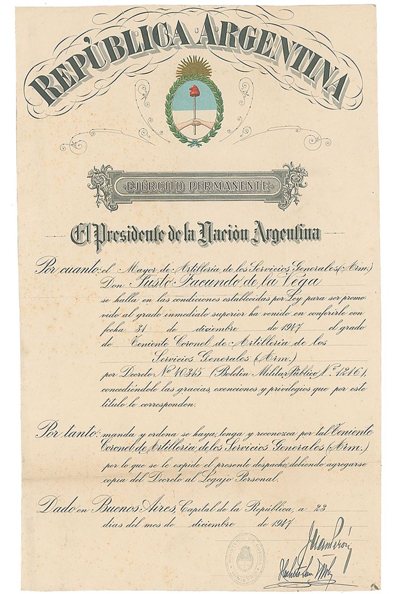 DS, one page, 10.25 x 16.75, December 23, 1947. Untranslated document in Spanish regarding a promotion, signed at the conclusion by Peron. Scattered creases and foxing, otherwise fine condition.