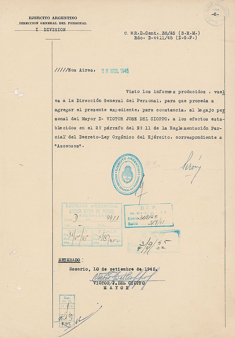 DS, in Spanish, signed “Peron,” one page, 9 x 12.5, September 10, 1945. Untranslated official document, signed at the conclusion by Peron. Expected stamps and notations, punch holes and tears to left side, and scattered creasing, otherwise very good condition.