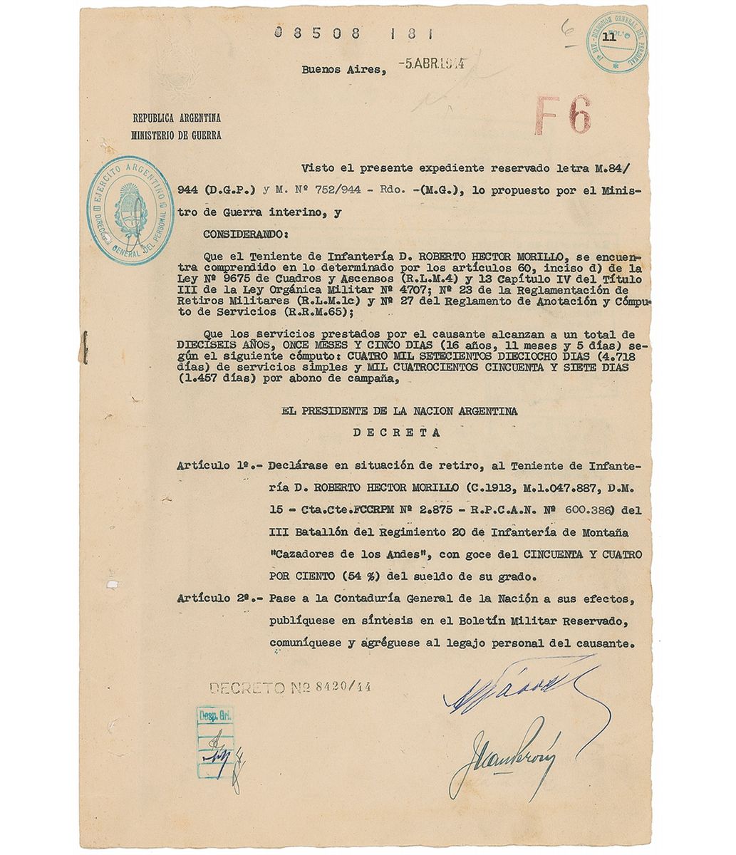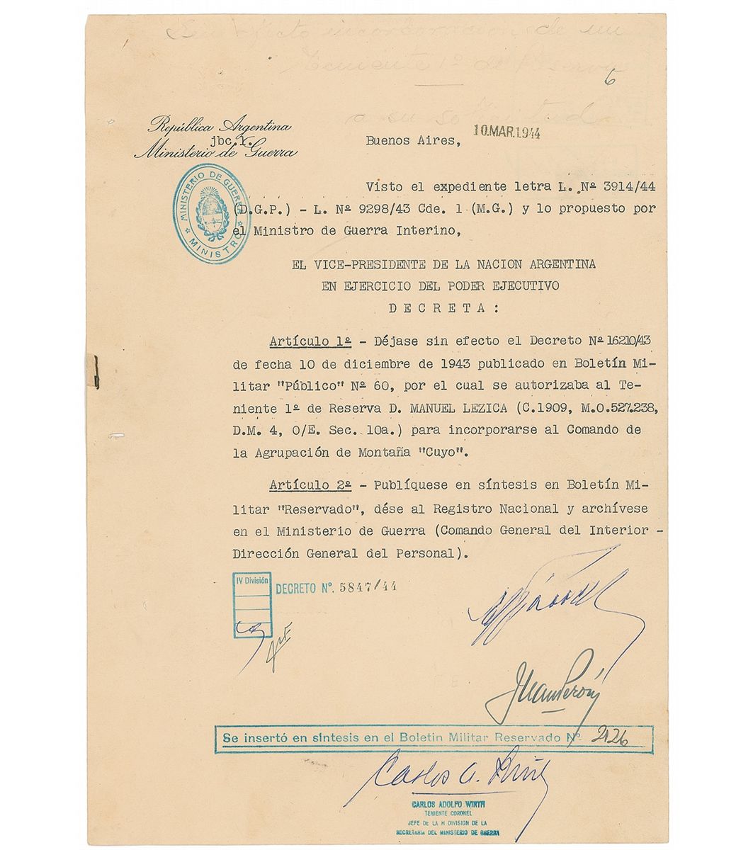 Two DSs in Spanish, each one page, 8.75 x 12.5, dated 1944. Untranslated documents signed at the conclusion by Peron and Argentina’s de facto president Edelmiro Farrell, along with other officials. Expected document wear and binding holes to left edge, otherwise overall fine condition. In 1944, Peron served as Farrell’s vice president, Secretary of War, and Minister of Labor, actively building public support for his own election to the presidency in 1946.
