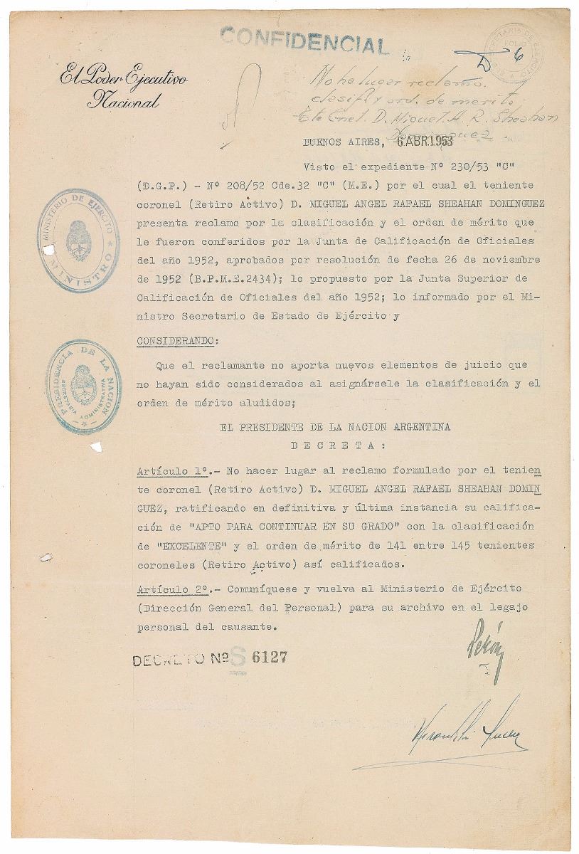 DS in Spanish, signed “Peron,” one page, 9 x 13.25, April 6, 1953. Untranslated document concerning a military officer, signed at the conclusion by Peron. In very good to fine condition, with three punch holes to left side.