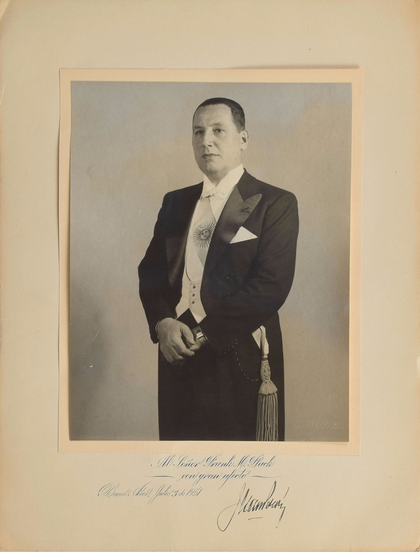 Argentine lieutenant general and politician (1895–1974) who was thrice elected President of Argentina. Vintage matte-finish 8.25 x 10.75 portrait of Peron in a distinguished three-quarter-length pose, affixed to its original 12.5 x 16.5 mount, inscribed on the mount in another hand, "Al Senor Frank M. Flack, con gran afecto, Buenos Aires, Julio 3 de 1951," and signed in fountain pen by Peron. Photo is blindstamped in the lower right corner, "Subscretaria de Informacion, Archivo Grafico de la Nacion." In very good to fine condition, with a crease to the left side of the border and image, and light silvering to the darker areas of the portrait.