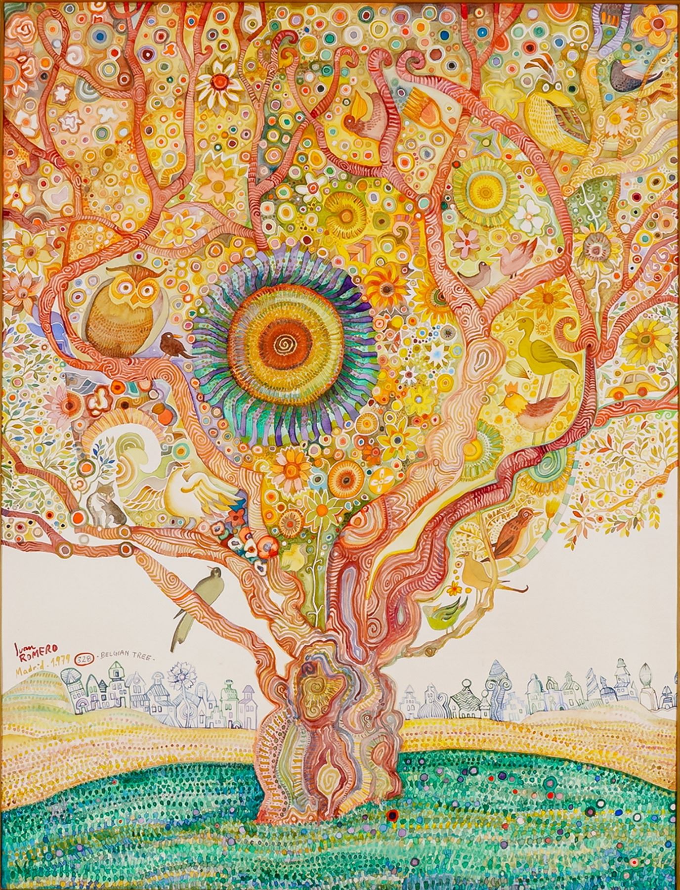 Juan Romero's Belgian Tree, created in Madrid in 1979, is a dazzling watercolor on paper alive with color, rhythm, and imagination. The composition is a mesmerizing explosion of swirling lines, stylized birds, owls, flowers, and a radiant sun-like core, all anchored by a richly patterned tree that seems to pulsate with life. This work exemplifies Romero's signature fantastical style, blending elements of folk art, surrealism, and psychedelic intricacy. Juan Romero was a celebrated Spanish painter associated with vibrant figurative and symbolic compositions. His career flourished internationally, with exhibitions across Europe, and his work is admired for its joyful color palette and elaborate, dreamlike worlds. This piece, titled Belgian Tree, reflects his mastery in creating enchanting universes that blur the boundaries between fantasy and reality. Housed in a modern gilt frame with matting, this work is both a captivating decorative statement and a collectible artwork by an acclaimed Spanish master. Signed, titled, and dated at the lower left.