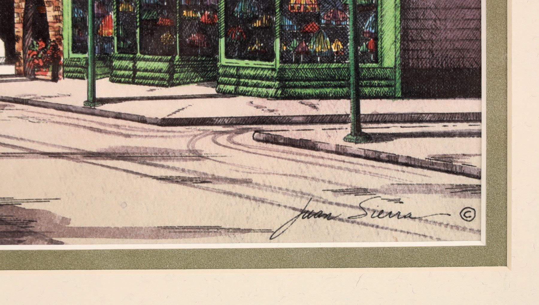A 17"x 20" matted and framed print by artist Juan Sierra of the main street in Pleasanton, California. Sierra is a California native and has painted many of the Victorian and Queen Ann houses in the area. Frame is slightly nicked, but ready to hang. Please see photos for more details.