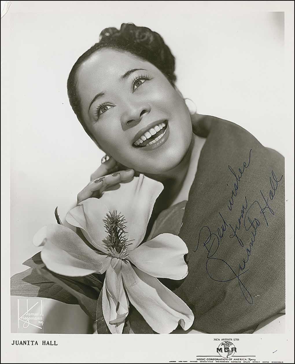 Vintage glossy 8 x 10 publicity photo, signed in blue ink, “Best wishes from Juanita Hall.” In fine condition, with creasing to three corners, and a surface mark to facial area.