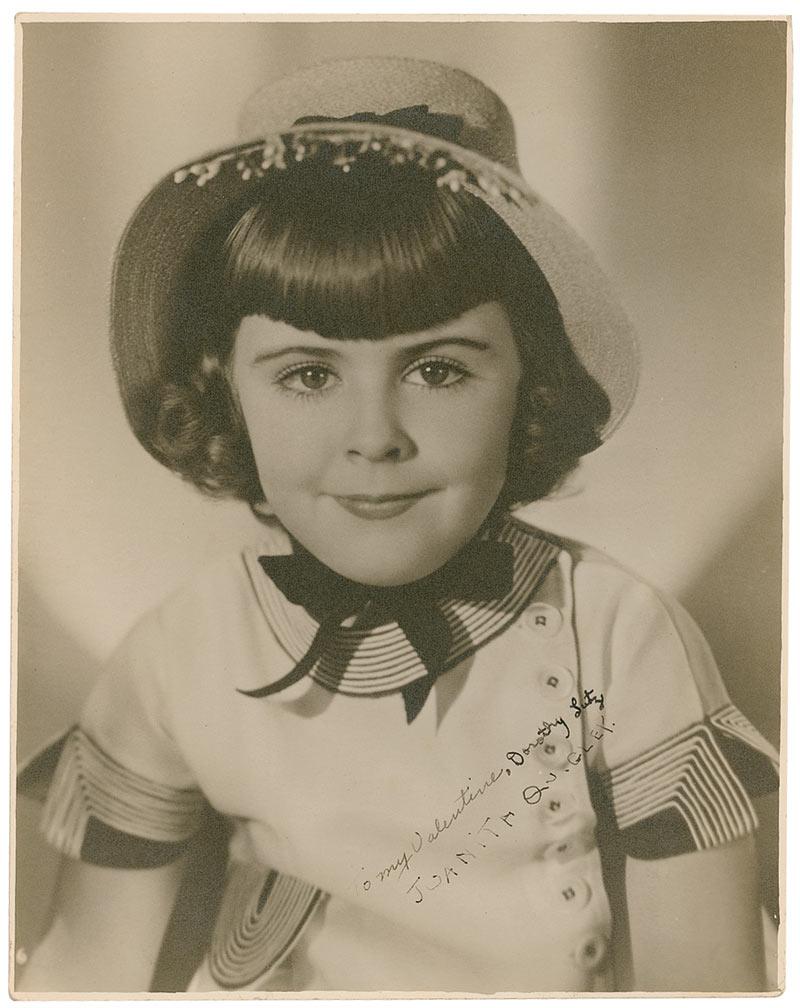 Child actress who appeared in two Our Gang comedies but is best known as playing Elizabeth Taylor’s sister in National Velvet. Vintage matte-finish 7.75 x 9.75 photo, inscribed in another hand “To my Valentine, Dorothy Lutz” and signed in fountain pen “Juanita Quigley.” A couple of light creases, small stain touching her hair, trimmed edges, silvering to some of the darker portions, and very little ink adhesion to the “T” in the inscription, otherwise fine condition. A collector notation on the reverse states that she was four years old at the time.