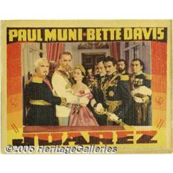 <B>Juarez (Warner Brothers, 1939)</B></I> Lobby Card (11" X 14"). The sweeping story of the historical conflict between Mexican president Juarez and the shadow government of France's Napoleon III. Paul Muni, as usual, completely transforms himself into the character of Juarez. Bette Davis is superb with her fall into madness as Empress Carlotta and Brian Aherne is touching in the potentially unsympathetic role of Emperor Maximilian. Co-starring Claude Rains, John Garfield, Donald Crisp, Gale Sondergaard and Gilbert Roland. Slight edge and corner wear, small corner crease, staining on two borders and the usual light toning that comes with Warner Brothers linen stock. Very Fine.