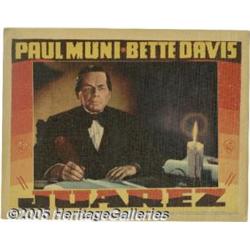 <B>Juarez (Warner Brothers, 1939)</B></I> Lobby Card (11" X 14"). Paul Muni plays the Zapotec-Indian-turned-Mexican President Benito Juarez in this elaborate Warner's costume drama. The talented makeup artist on the Warner's lot, along with a stoic performance, masterfully transforms Muni into the Mexican leader. Offered in this lot is a terrific shot of Muni, in period dress, as the so-called "Abraham Lincoln of Mexico." Other than the typical toning of the linen stock, this lobby card is in excellent condition. Very Fine+.