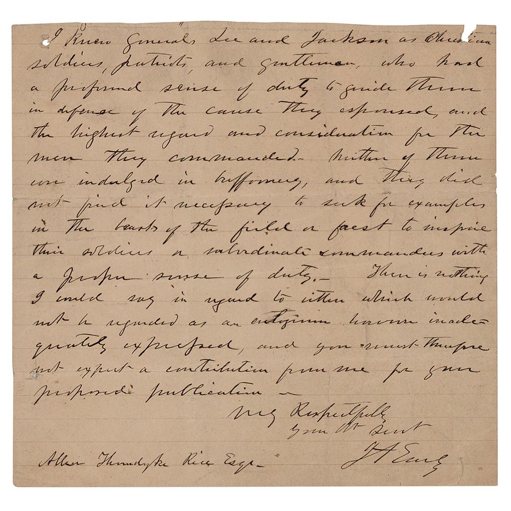 Partial ALS signed "J. A. Early," one page, 8 x 7.5, no date. Conclusion of a letter to Allen Thorndyke Rice, editor of the North American Review. In full: "I knew Generals Lee and Jackson as Christian soldiers, patriots, and gentlemen, who had a profound sense of duty to guide them in defense of the cause they espoused, and the highest regard and consideration for the men they commanded. Neither of them ever indulged in buffoonery, and they did not find it necessary to seek for examples in the beasts of the field or forest to inspire their soldiers or subordinate commanders with a proper sense of duty. There is nothing I could say in regard to either which would not be regarded as an antagonism however inadequately expressed, and you must therefore not expect a contribution from me for your proposed publication." In fine condition, with a trimmed top edge, and a small hole and small tear touching two letters of text. A remarkable testimonial piece connecting some of the South's most famous generals of the Civil War—Jubal A. Early, Robert E. Lee, and Stonewall Jackson.