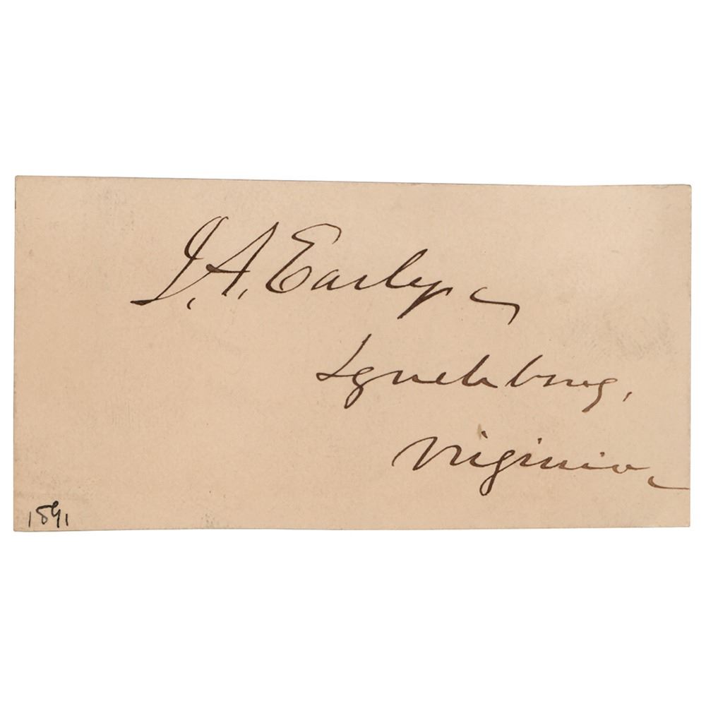 Confederate general (1816-1894) who led troops at Antietam, Chancellorsville, Gettysburg, and Spotsylvania. Ink signature, "J. A. Early, Lynchburg, Virginia," on an off-white 3.5 x 1.75 card. In very fine condition.