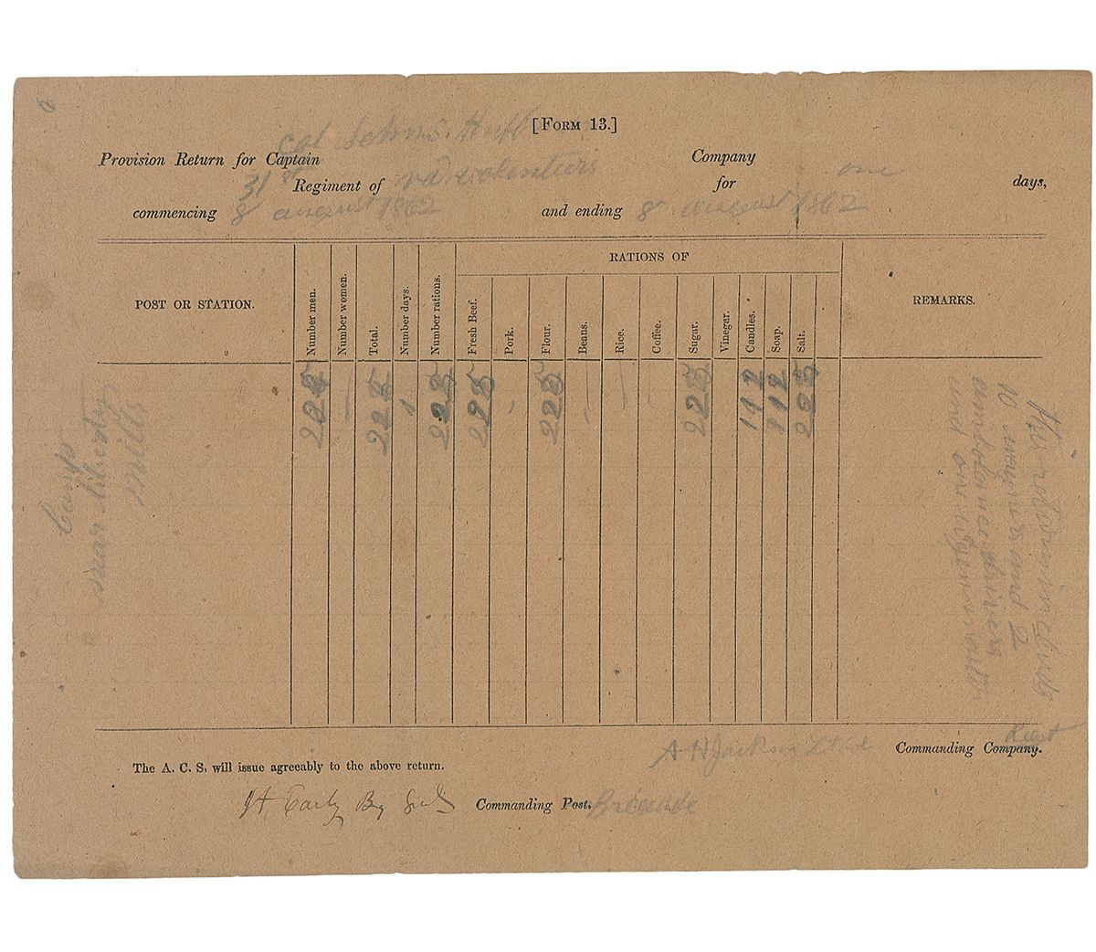 Civil War–dated partly-printed DS, signed “J. A. Early, Brig Genl,” one page, 10.25 x 7.5, August 8, 1862. A provision return accounting for one day of supplies for Colonel John S. Hoff of the Virginia Volunteers, filled out in another hand in pencil, reporting on rations for 225 men, listing items such as “Fresh Beef,” “Pork,” “Flour,” “Sugar,” “Candles,” “Soap,” and “Salt.” Two vertical folds and a moderate uniform shade of toning, otherwise fine condition. Early had been seriously wounded during the Battle of Williamsburg just a few months earlier in May; it took him nearly two months to recover before returning to the battlefield at the very end of June. The day after signing this document, on August 9, 1862, Early served with distinction in the Southern victory at the Battle of Cedar Mountain. Extremely scarce in war-dated military documents.