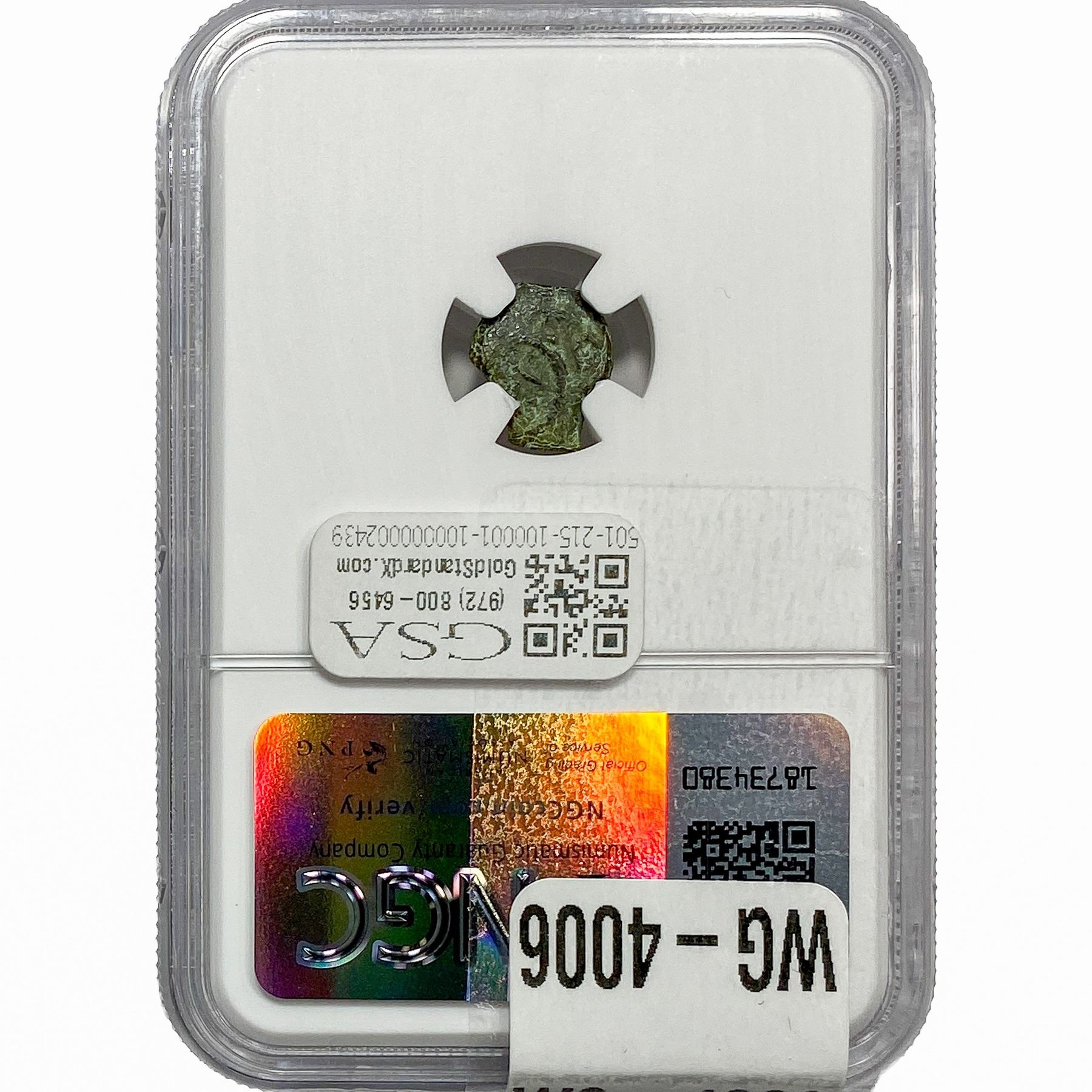 e. Coins sold referencing a third-party grading service are sold “AS IS” without any express or implied warranty, except for a guarantee by GSA that they are genuine. Removal or alteration of the holder, voids all of Bidder’s claims concerning that Product. Certain warranties may be available from the grading services and Bidders are referred to them for further details: Numismatic Guaranty Corporation (NGC), PO Box 4776, Sarasota, FL 34230, www.ngccoin.com/services/writtenguarantee.asp; Professional Coin Grading Services (PCGS), PO Box 9458, Newport Beach, CA 92658, www.pcgs.com/guarantee.html; ANACS, 6555 S. Kenton St., Ste. 303, Englewood, CO 80111; and Independent Coin Grading Co. (ICG), 7901 East Bellview, Ave., Suite 50, Englewood, CO 80111.