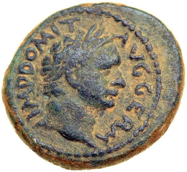 Judaea Capta. Domitian, AD 81-96. AE 19 minted at Caesarea. Laureate head right of Domitian. Reverse: Trophy. AJC plate 36, 5; H-751. About Extremely Fine.