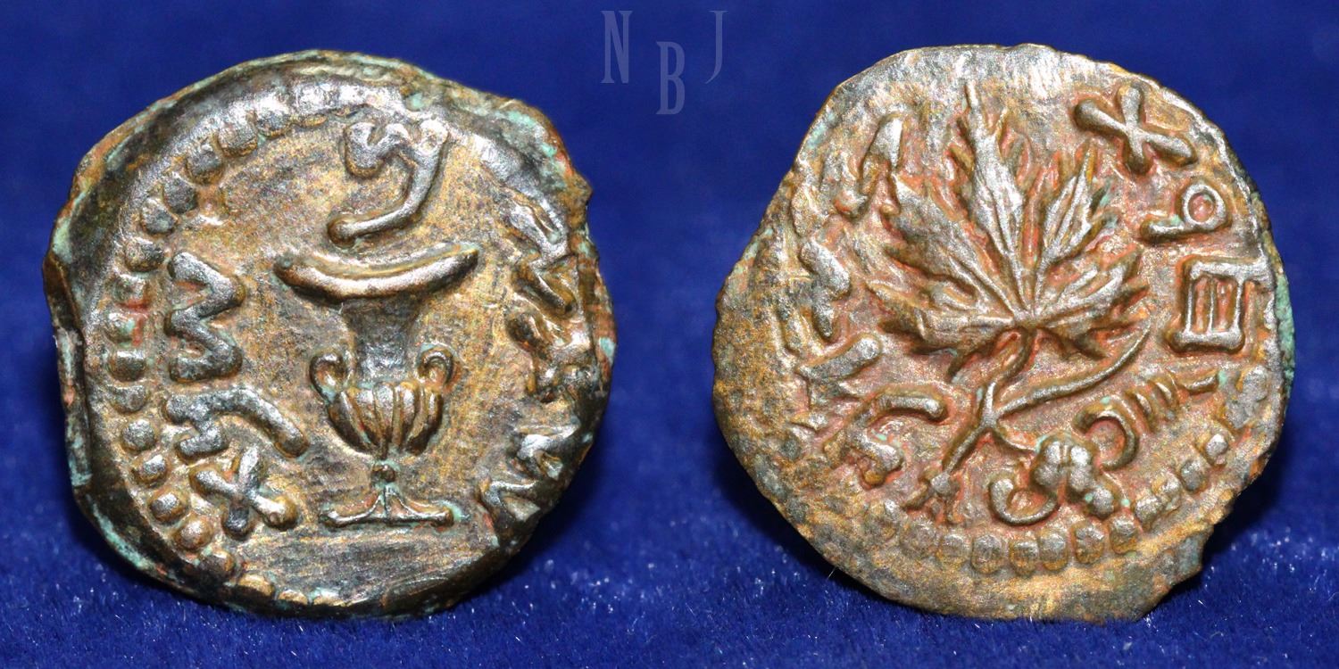 Judaea: The Jewish War. AE Prutah. 66-70 CE. Jerusalem, year 2 (67/8 CE). 'Year two' (Paleo-Hebrew), amphora with broad rim and two handles. 'The freedom of Zion' (Paleo-Hebrew), vine leaf on small branch with tendril. (2.96gm, 18mm) Extremely Fine.