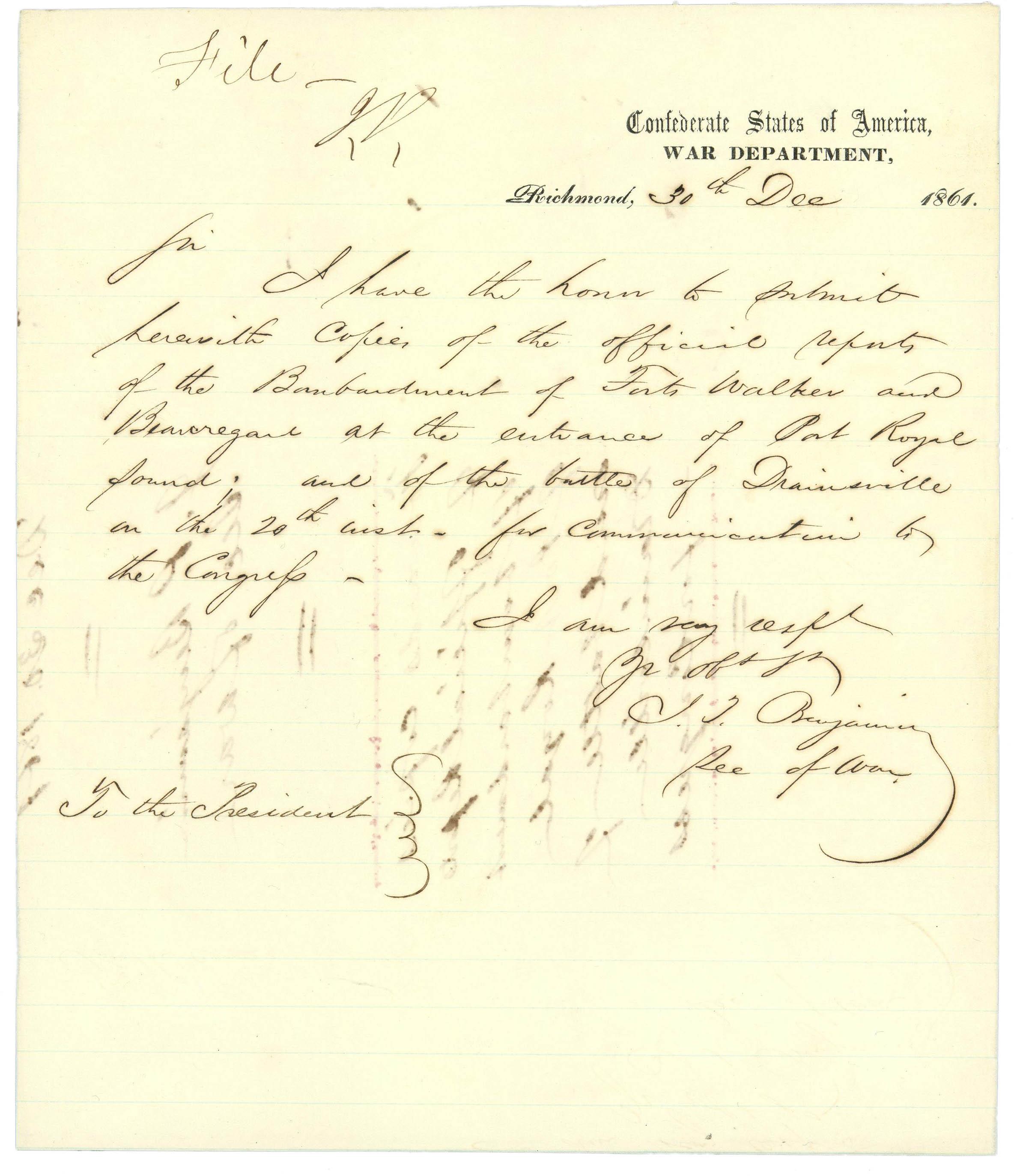 Confederate Secretary of War Judah Benjamin autograph letter signed, dated 30 December 1861. Here, Benjamin sends his official reports of the attacks on Forts Walker and Beauregard to President Jefferson Davis. Letter, on ''Confederate States of America / War Department'' letterhead reads, ''I have the honor to submit herewith copies of the official reports of the Bombardment of Forts Walker and Beauregard at the entrance of Port Royal Sound; and of the battle of Drainsville of the 20th inst. for communication to the Congress.'' Endorsed by Davis, ''File. JD'' Some show-through, else near fine condition.