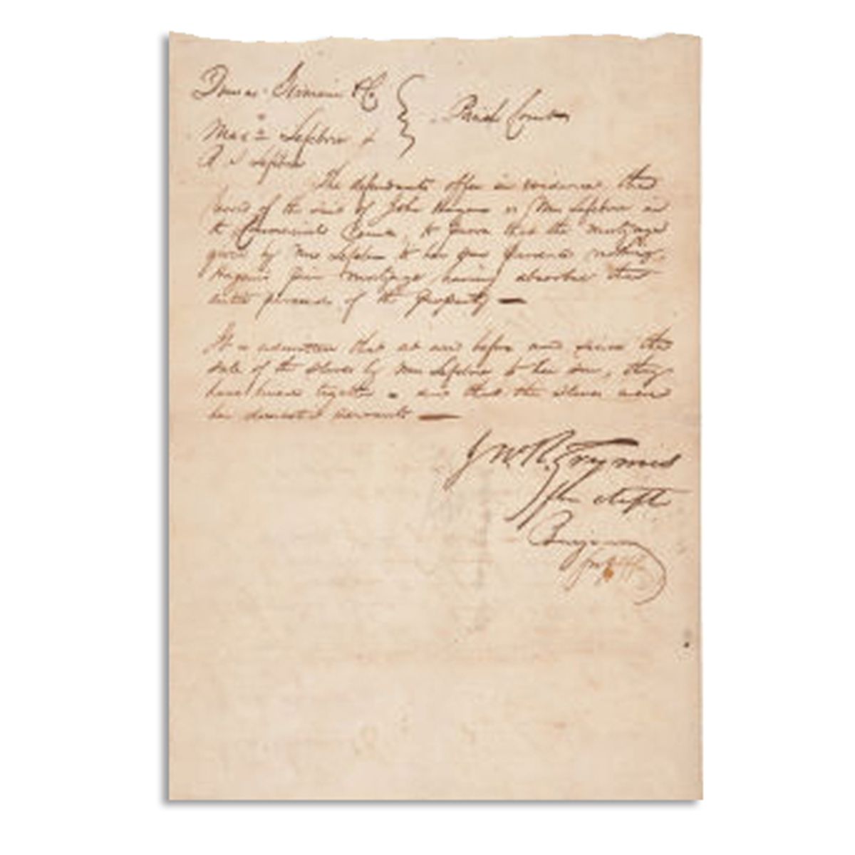 Confederate Secretary of War and State Judah Benjamin document signed ''Benjamin'' regarding the sale of slaves in Louisiana. Parish court document filed 27 April 1843 reads in part, ''The defendants offer in evidence the record…to prove that the mortgage given by Mrs. Lefebre to her son produced nothing…It is admitted that at and before and since the sale of the slaves by Mrs. Lefebre to her son, they have lived together and that the slaves were her domestic servants.'' Single page measures 7.75'' x 11''. In very good condition.