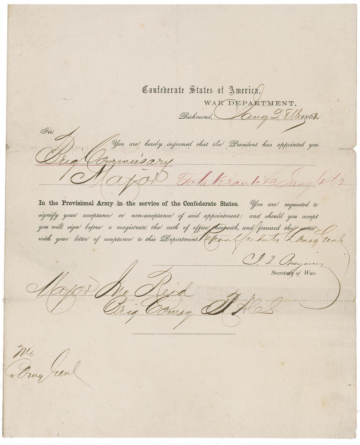 British-born American politician and lawyer (1811-1884) who, after serving in the US Senate and rejecting nomination to the Supreme Court, served variously as attorney general, secretary of war, and secretary of state for the Confederacy. Partly-printed war-dated DS, signed “J. P. Benjamin,” one page, 8.25 x 10.25, January 28, 1862. Confederate States of America military commission appointing John Reid to the rank of “Brigadier Commissary Major in the Provisional Army in the service of the Confederate States. You are requested to signify your acceptance or non-acceptance of said appointment: and should you accept you will sign before a magistrate, the oath of office therewith, and forward the same with your letter of acceptance to this Department. Report for duty to Comsy Genl.” Signed at the conclusion by Benjamin. In very good condition, with old tape repairs on reverse of horizontal folds, a couple small fold separations, and scattered toning and soiling. On August 3, 1861, Congressman John Reid withdrew from the US House of Representatives and returned to Missouri. There he organized a company of volunteers and first saw action at the First Battle of Lexington, also known as the Battle of the Hemp Bales.