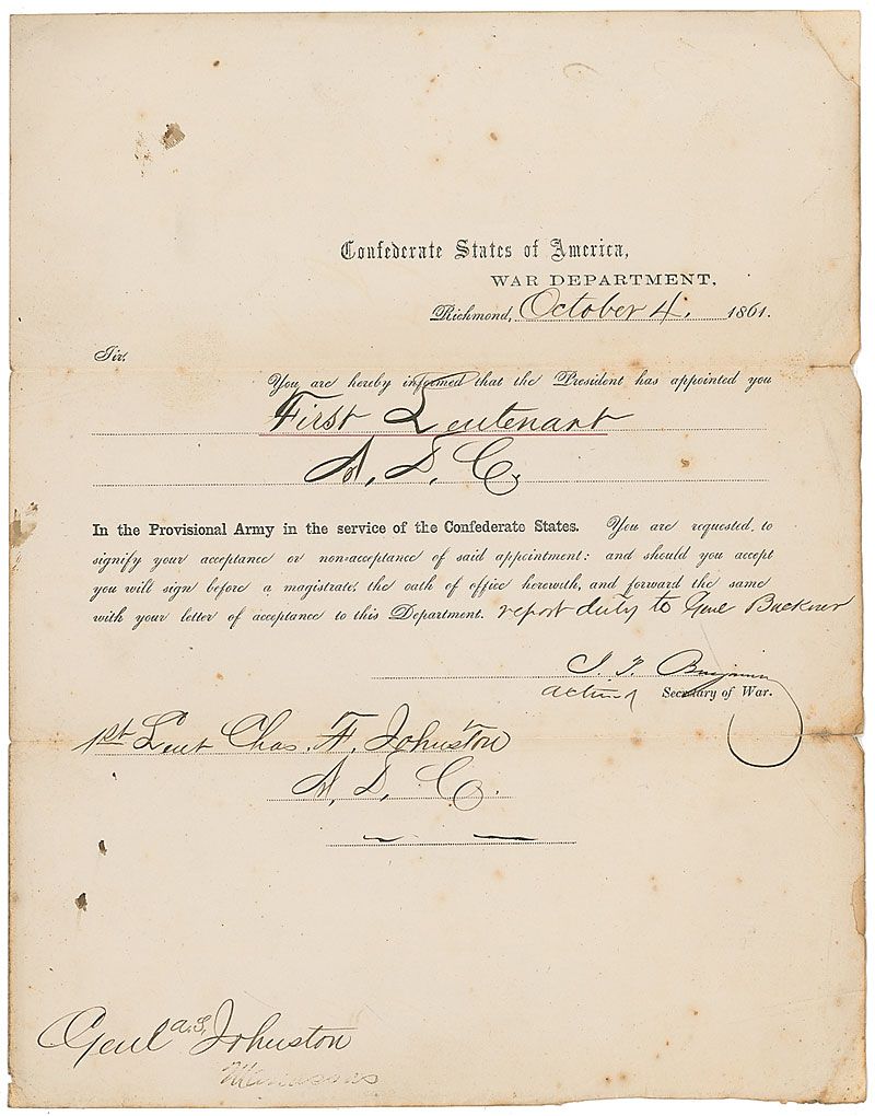 British-born American politician and lawyer (1811–1884) who, after serving in the US Senate and rejecting nomination to the Supreme Court, served variously as attorney general, secretary of war, and secretary of state for the Confederacy. War-dated partly-printed DS, signed “J. P. Benjamin,” one page, 8.25 x 10.75, October 4, 1861. Appointment reads, in full: “Sir, You are hereby informed that the President has appointed you First Lieutenant A.D.C. in the Provisional Army in the service of the Confederate States. You are requested to signify your acceptance or non-acceptance of said appointment: and should you accept you will sign before a magistrate the oath of office herewith, and forward the same with your letter of acceptance to this Department. Report duty to Genl Buckner.” In very good condition, with scattered creases and dampstaining, tape reinforcement to reverse of one horizontal fold, and scattered ink marks and foxing.