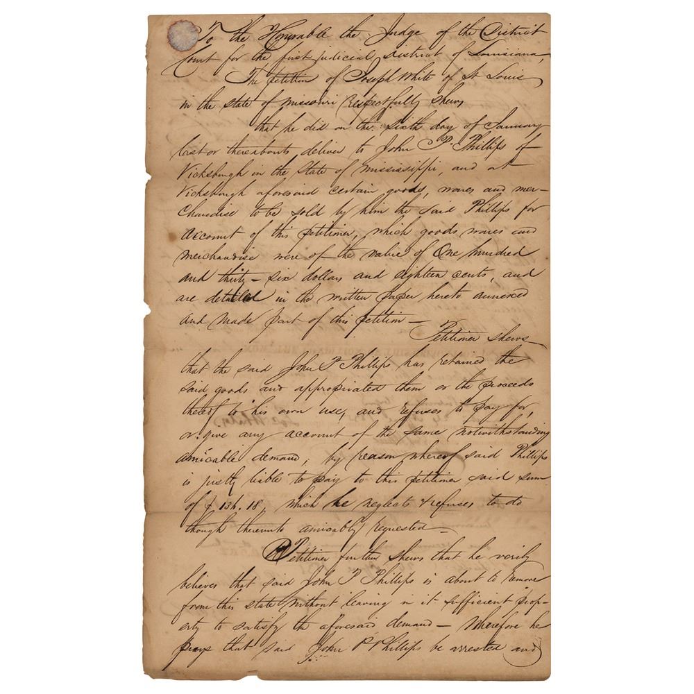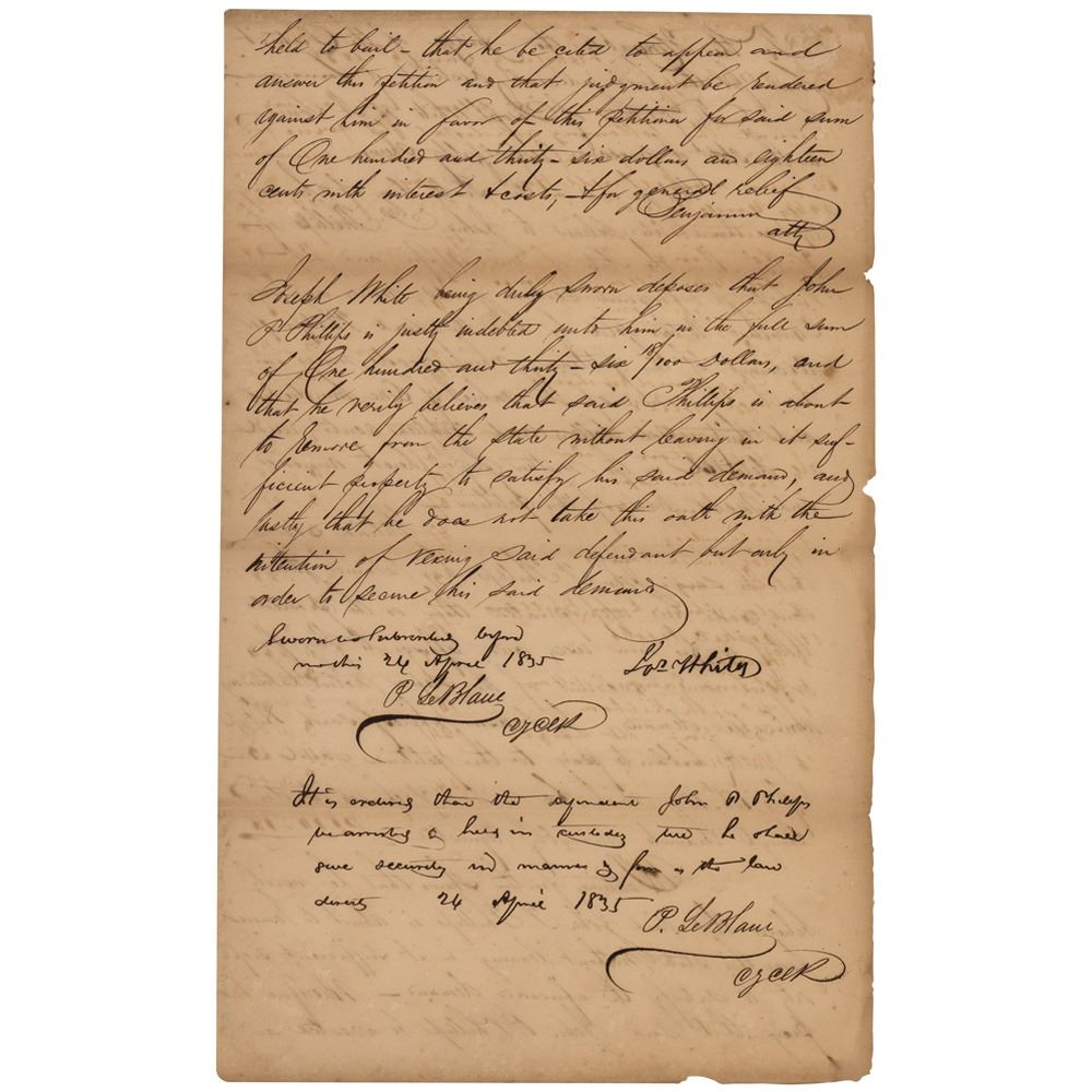 British-born American politician and lawyer (1811–1884) who, after serving in the US Senate and rejecting nomination to the Supreme Court, served variously as attorney general, secretary of war, and secretary of state for the Confederacy. ADS signed "Benjamin, atty," one page both sides, 8 x 13, April 24, 1835. A handwritten petition in the lawsuit between Joseph White and John P. Phillips, in part: "Petitioner further shews that he verily believes that said John P. Phillips is about to remove from this state without leaving in it sufficient property to satisfy the aforesaid demand—wherefore he prays that the said John P. Phillips be arrested and held to bail, that he be cited to appear and answer the petition and that judgment be rendered against him in favor of this petitioner for said sum of One hundred and thirty-six dollars and eighteen cents." In fine condition, with light toning along the folds, and some minor edge chipping.