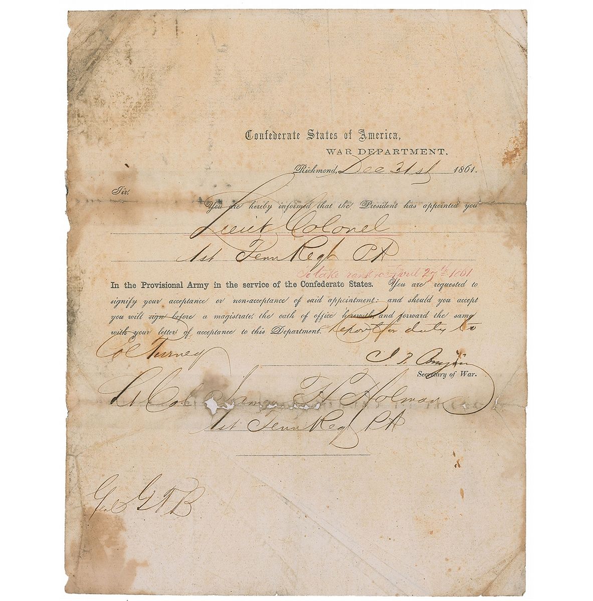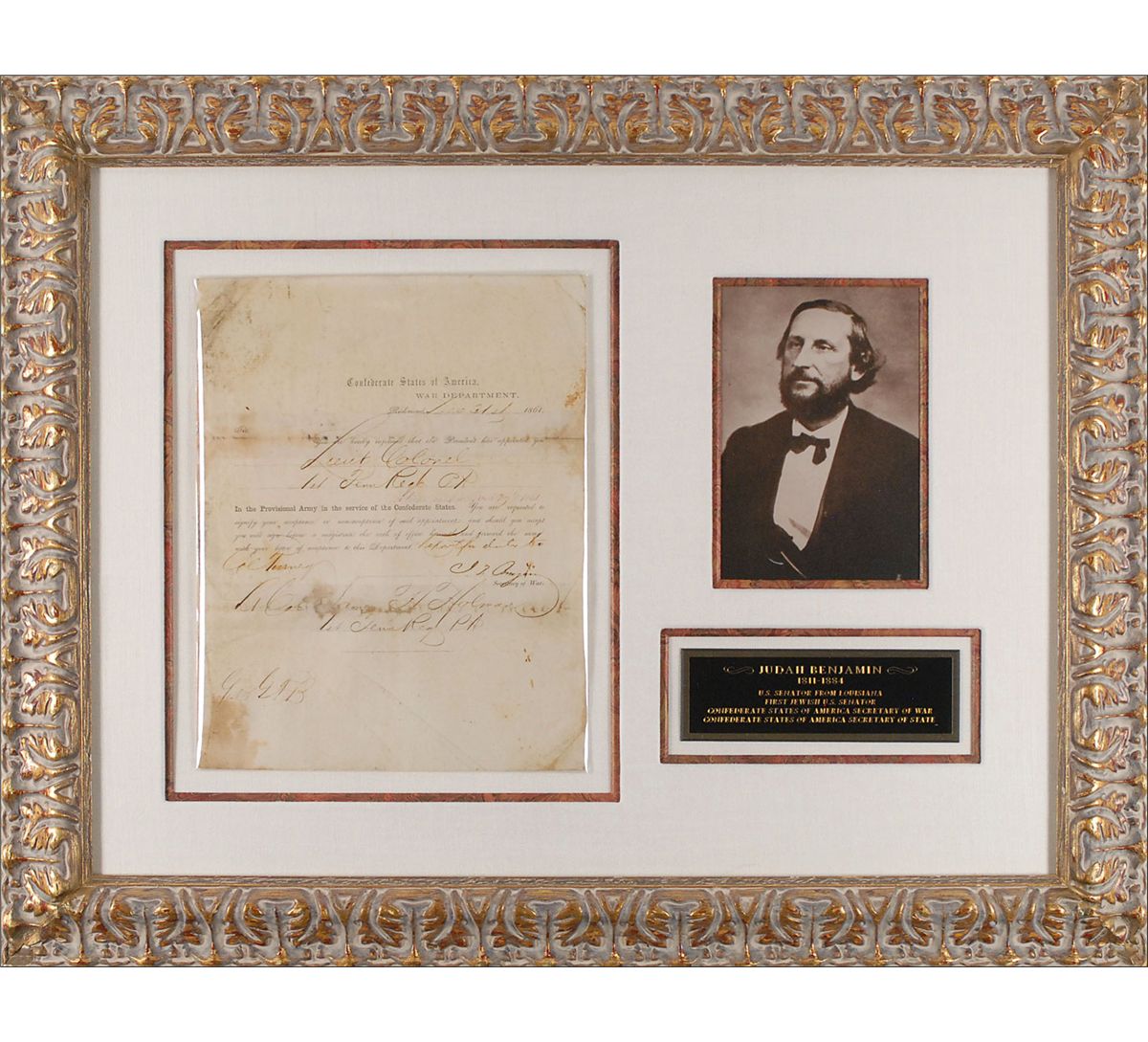 British-born American politician and lawyer (1811–1884) who, after serving in the US Senate and rejecting nomination to the Supreme Court, served variously as attorney general, secretary of war, and secretary of state for the Confederacy. Civil War–dated partly-printed DS, signed “J. P. Benjamin,” one page, 8.25 x 10.25, December 31, 1861. Benjamin informs James H. Holman that “the President has appointed you Lieutenant Colonel 1st Tenn Regt PA In the Provisional Army in the service of the Confederate States…Report for duty to Col. Turney.” Signed at the conclusion by Benjamin as secretary of war of the Confederate States of America. Expertly and handsomely mounted, cloth-matted, and framed with a portrait and nameplate to an overall size of 24.75 x 19.25. Repaired separations to horizontal folds (not affecting the signature), scattered staining and soiling, and a bit of paper loss to lower horizontal fold, otherwise very good condition. Oversized.