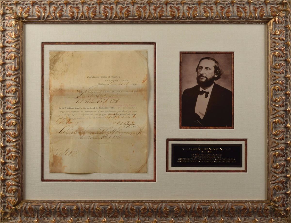 British-born American politician and lawyer (1811-1884) who, after serving in the US Senate and rejecting nomination to the Supreme Court, served variously as attorney general, secretary of war, and secretary of state for the Confederacy. Civil War-dated partly-printed DS, signed “J. P. Benjamin,” one page, 8.25 x 10.5, December 31, 1864. Benjamin appoints James H. Holman as "Lieut. Coonel, 1st Tenn. Regt. P. A. in the Provisional Army in the service of the Confederate States." Signed at the conclusion by Benjamin as secretary of war. Cloth-matted and framed with a plaque and portrait to an overall size of 24.75 x 19.25. In very good condition, with creasing, staining, and paper loss along the lower horizontal fold, apparently backed with archival tape on the reverse.