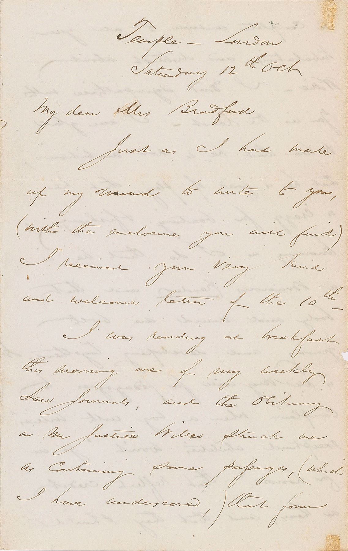 British-born American politician and lawyer (1811-1884) who, after serving in the US Senate and rejecting nomination to the Supreme Court, served variously as attorney general, secretary of war, and secretary of state for the Confederacy. Scarce ALS signed “J. P. Benjamin,” four pages on two adjoining sheets, 5 x 8, October 12, 1872. Written from "Temple—London," a letter to Mrs. Bradford, in full: "Just as I had made up my mind to write to you (with the enclosure you will find) I received your very kind and welcome letter of the 10th—I was reading at breakfast this morning one of my weekly Law Journals, and the obituary on Mr. Justice Giles struck me as containing some passages (which I have underscored) that form a complete answer to all your tribulations and distrust about Willie—I don‘t sympathize with you in the least—I am glad to hear that he is not ambitious, that he is fond of play, that he is crazy for boating and fishing, knowing as I do that he is a voracious reader and that body and mind are both growing and developing together. It is all very well for pedagogues to complain when a boy with Willie‘s exceptional abilities won't 'go in for honors' that reflect credit on them, and that they should appeal to the natural pride of a mother for aid in over-stimulating youthful emulation, but I don‘t believe the least bit in this hot house forcing of young intelligence—let the fruit ripen hardily in the open air and bright sun—Give me a boy with an inquiring mind, fond of reading, and then let him have the usual opportunities for study under competent instructions, after that ‘leave him alone.‘ Let the influences of collegiate life, the quiet impression produced by the reverence and respect paid to eminent learning and scholastic attainments in the little world where he lives produce their natural effect, and sooner or later, if not in the university, then in after life, all that is strong within him will reach full development, and he will be a man.