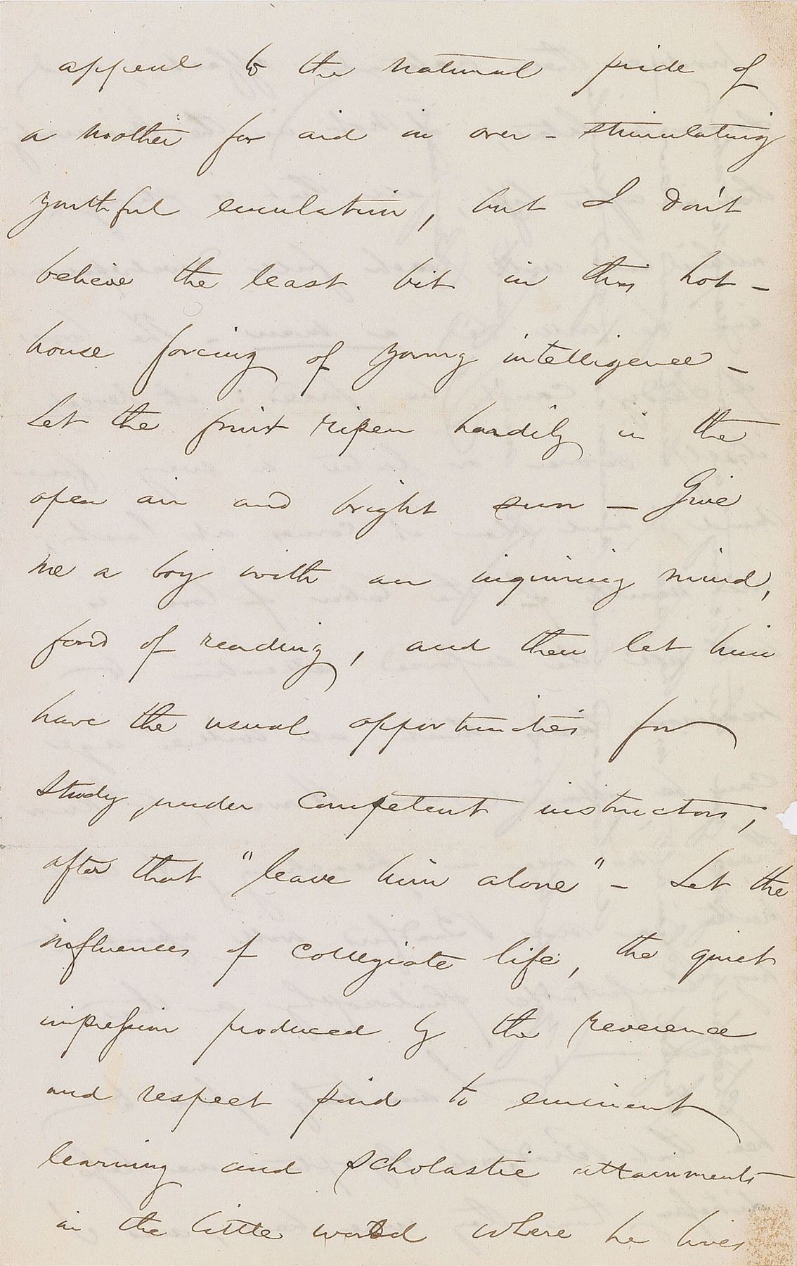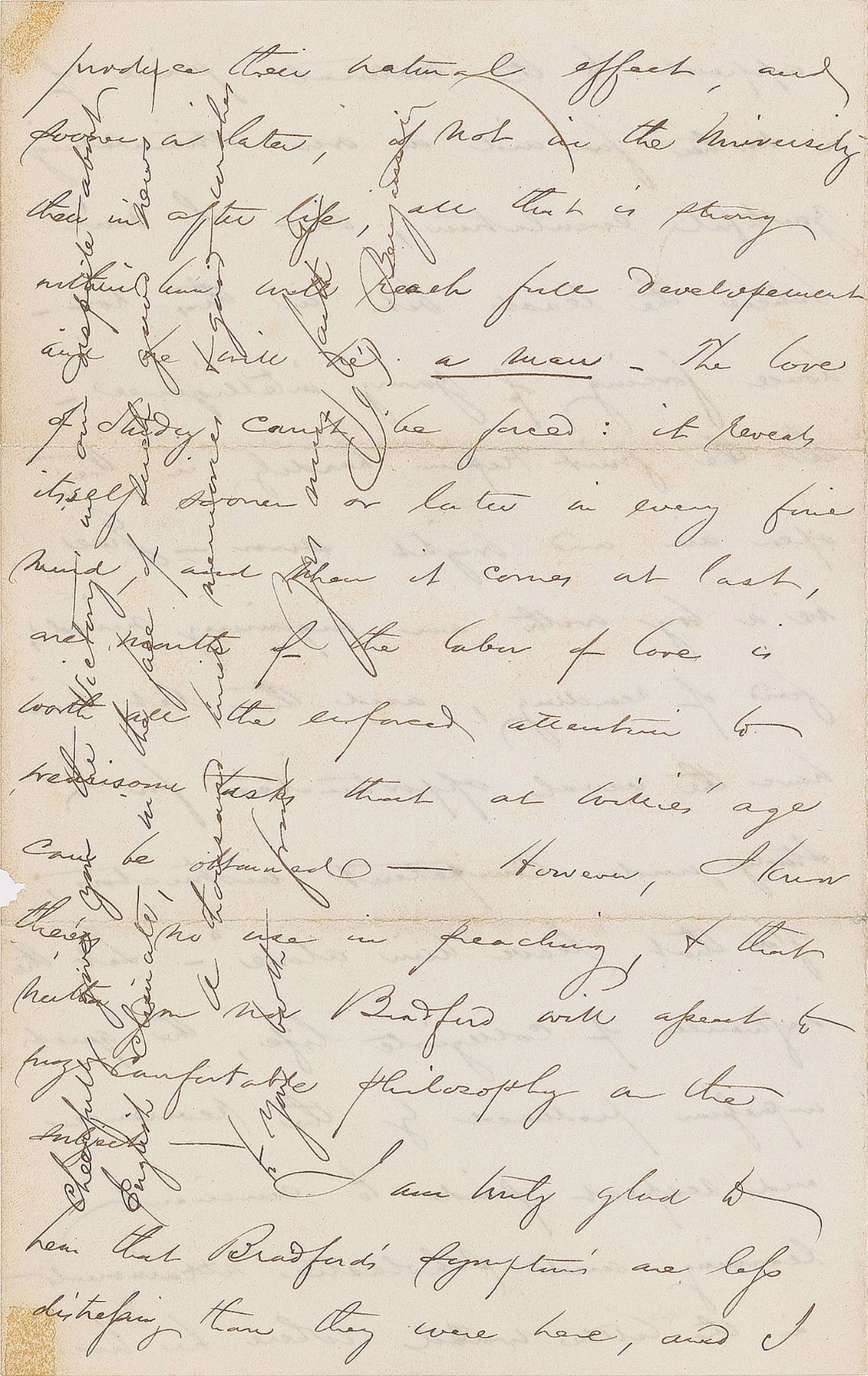 The love of study can‘t be forced: it reveals itself sooner or later in every line mind and then it comes at last. One month of the labor of love is worth all of the enforced attention to tiresome tasks that at Willie’s age can be obtained. However, there‘s no use in preaching and that nothing you nor Bradford will assert to can bring comfortable philosophy on the subject. I am truly glad to hear that Bradford's symptoms are less distressing than they were here, and I cheerfully give you the victory in our dispute about English climate, and in the face of such good news—a thousand kind memories and good wishes to you both." In fine condition, with a couple of light tape stains, and a small edge chip.