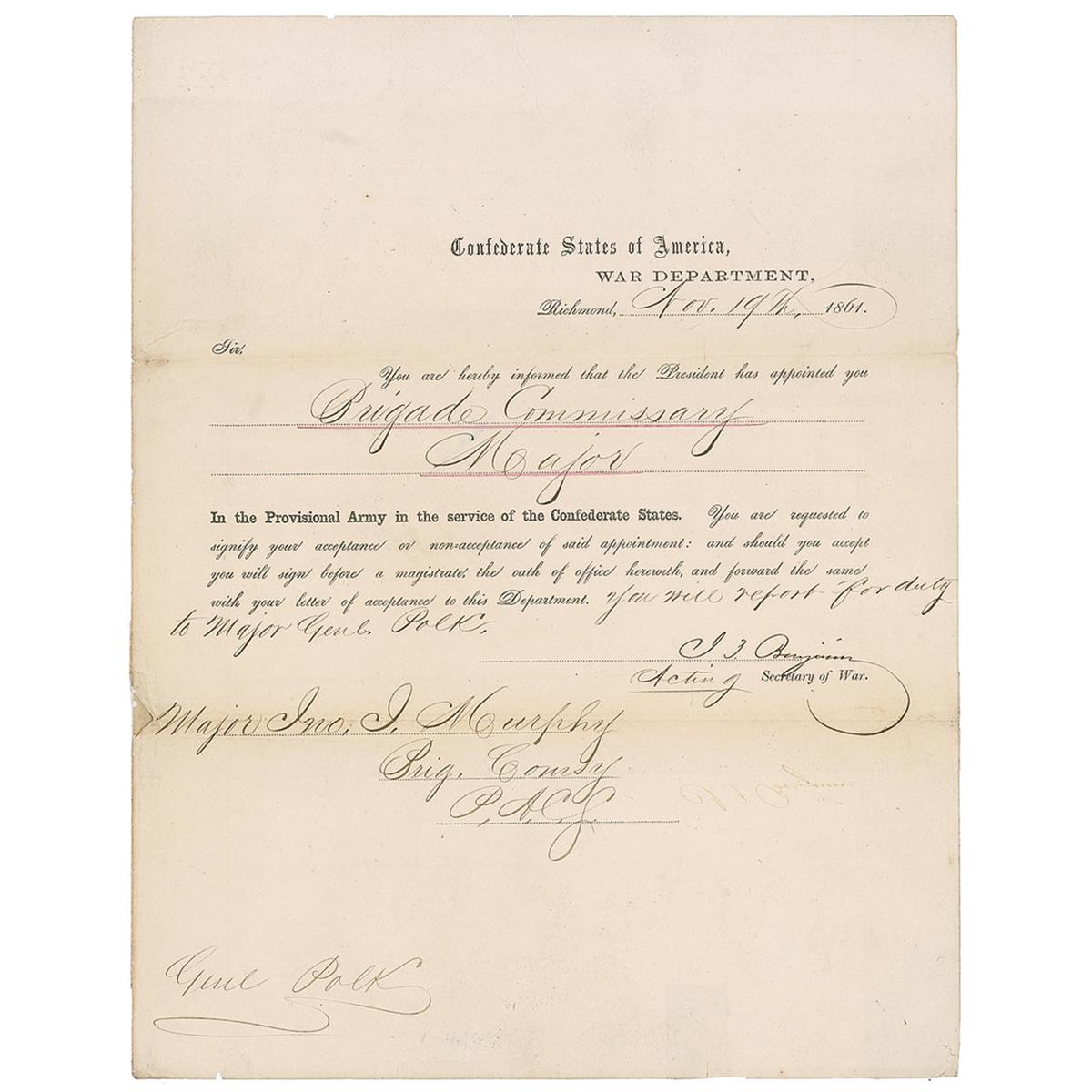 Partly-printed war-dated DS, signed “J. P. Benjamin,” one page, 8.5 x 10.75, November 19, 1861. Confederate commission appointing John J. Murphy “Brigade Commissary Major in the Provisional Army in the service of the Confederate States.” Signed at the conclusion by Benjamin as acting secretary of war. In very good condition, with scattered light creasing and wrinkling, tear to top edge, some light toning along horizontal folds, and light mirroring. Murphy would go on to become Chief of Staff to General Leonidas Polk. Accompanied by Murphy’s post-war presidential pardon, bearing a printed signature of Andrew Johnson. Pardon rates good to very good. A rare combination of a Confederate officer’s commission and the resulting presidential pardon.