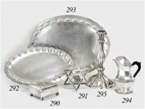 Silver, box with hinged cover raised on short supports, applied David star on the cover, glass lining, circa 1930, Diana mark, size: 8x10 cm, gross weight: 323.0 g, in good condition.
