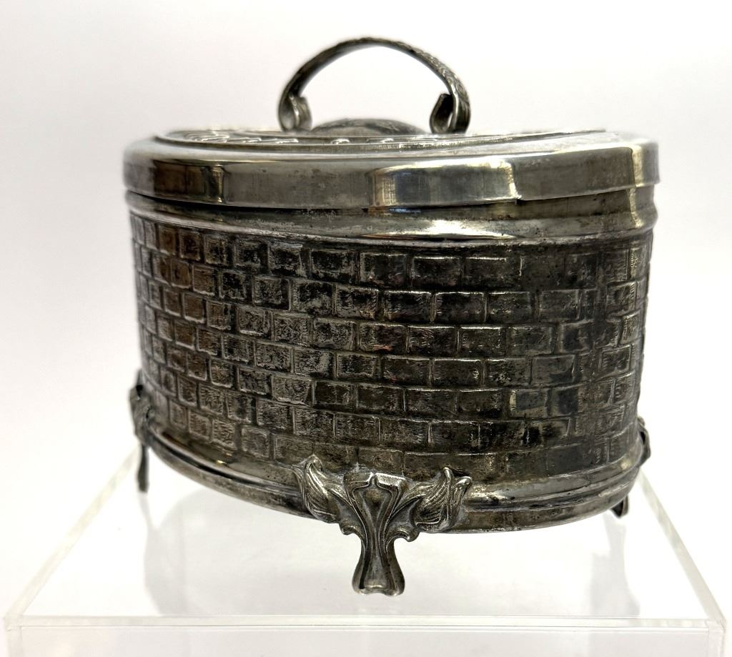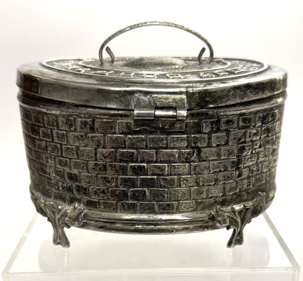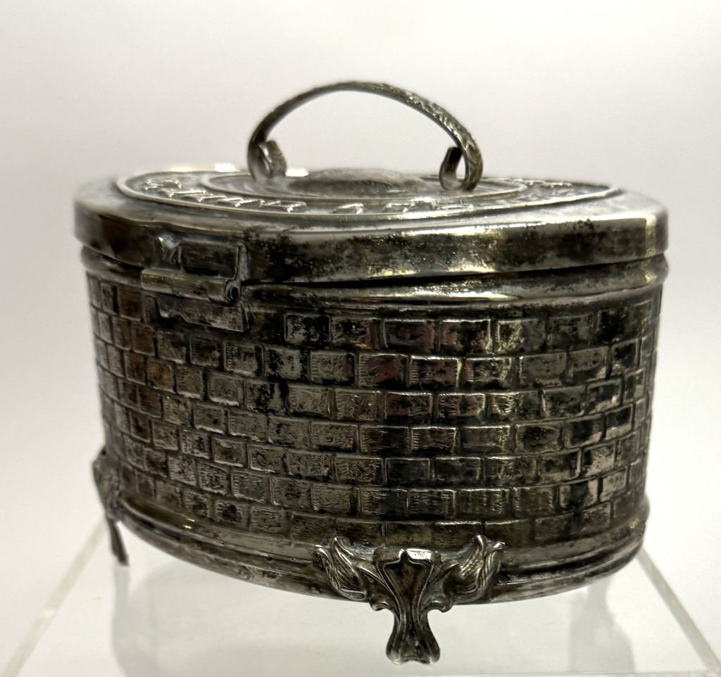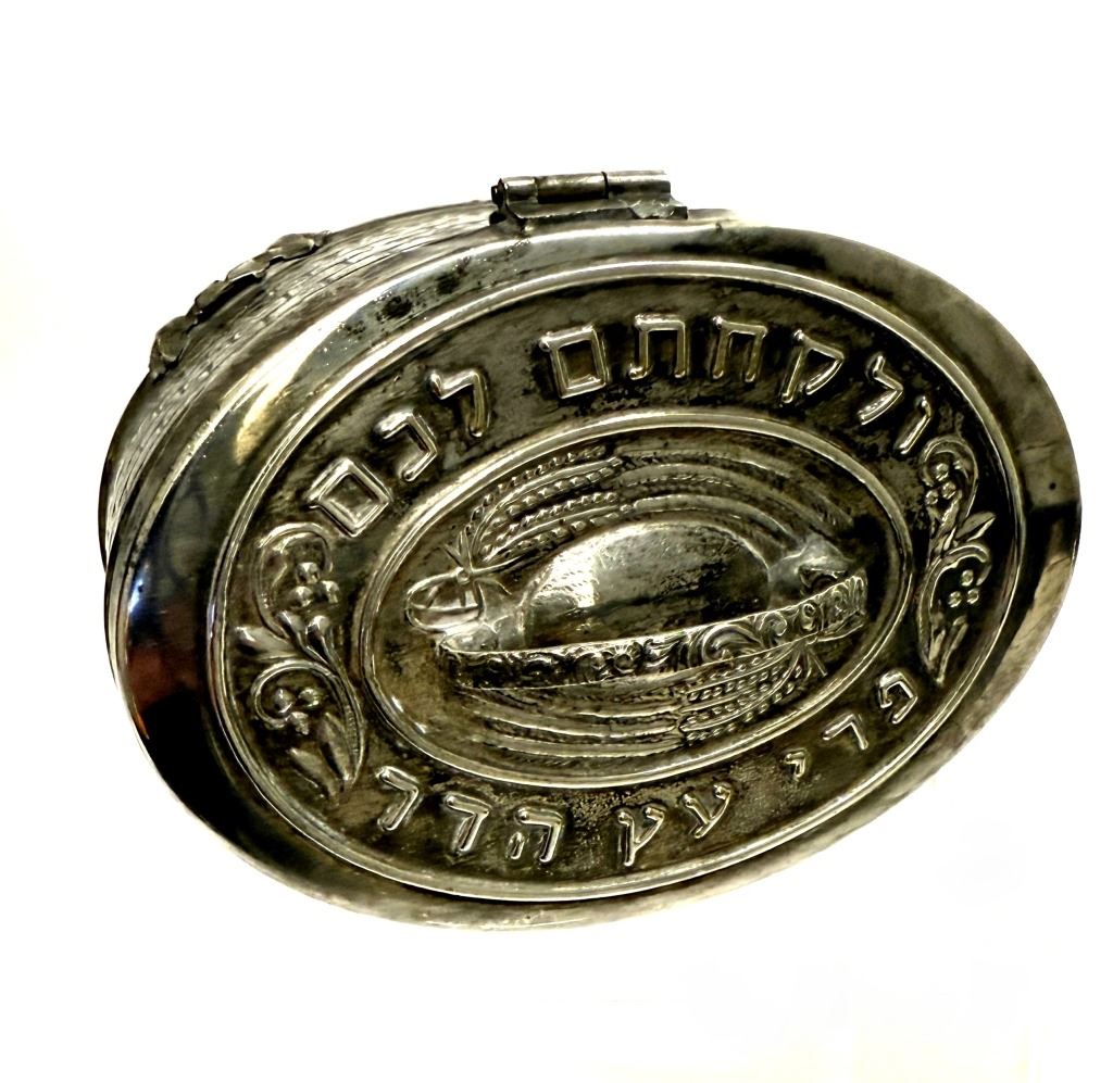 Item/Description: Vintage silver-plated Judaica etrog box, a Jewish ceremonial object used to hold the etrog (citron) during the holiday of Sukkot. Featuring an engraved depiction of an etrog on the lid and Hebrew text around the oval border with inscription: "And you shall take for yourselves the fruit of a beautiful tree". Includes a distinctive oval, brick-patterned body, hinged lid with a handle and is supported by ornate, scrolled feet.