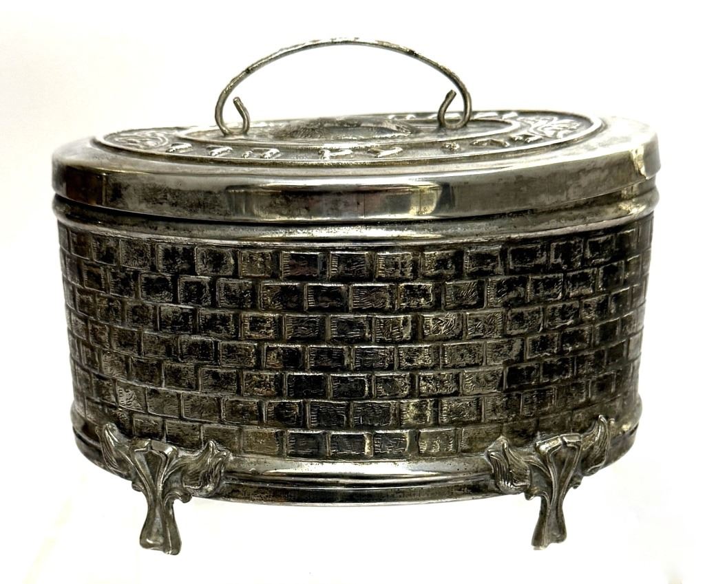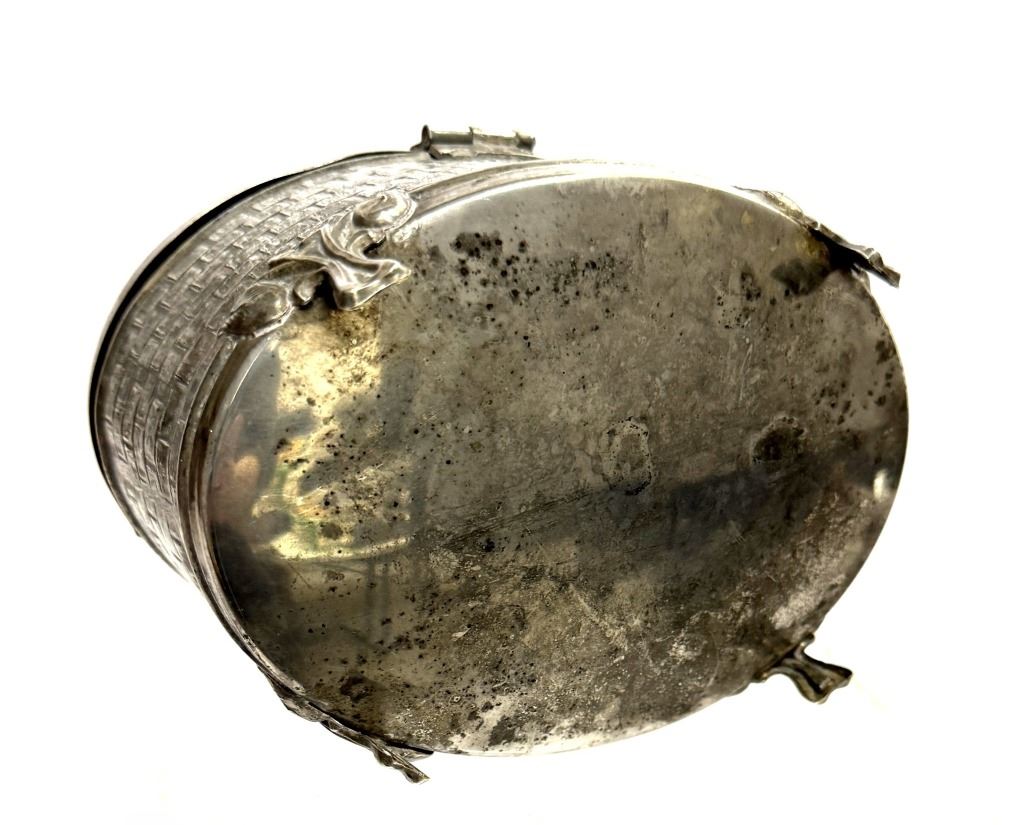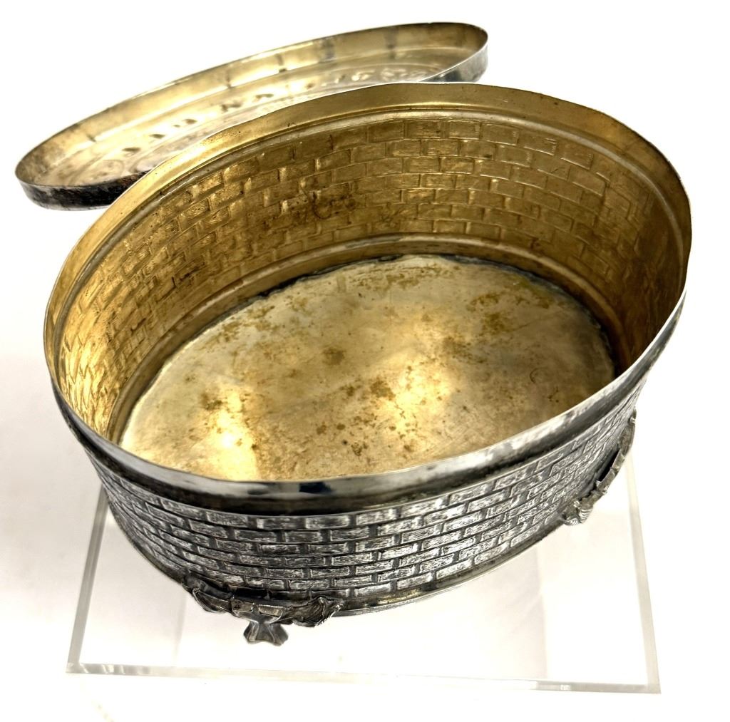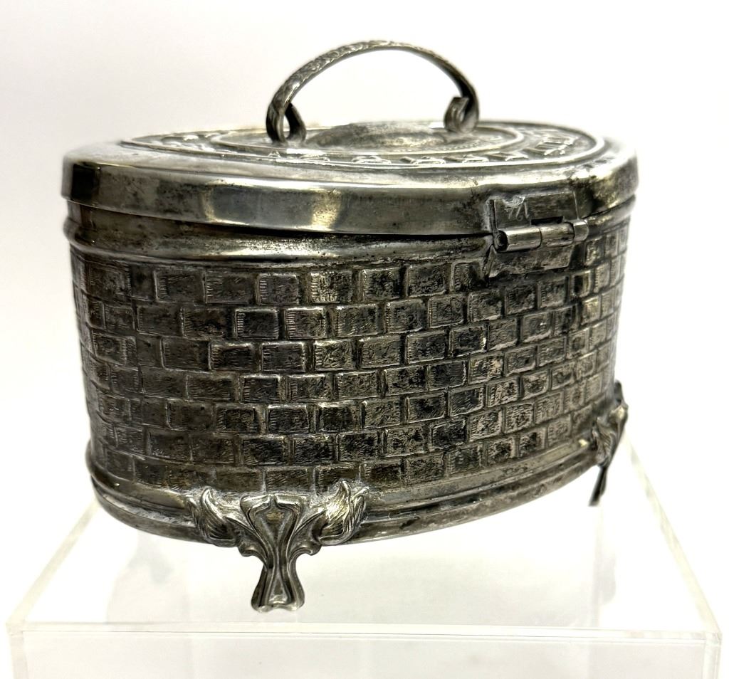 Item/Description: Vintage silver-plated Judaica etrog box, a Jewish ceremonial object used to hold the etrog (citron) during the holiday of Sukkot. Featuring an engraved depiction of an etrog on the lid and Hebrew text around the oval border with inscription: "And you shall take for yourselves the fruit of a beautiful tree". Includes a distinctive oval, brick-patterned body, hinged lid with a handle and is supported by ornate, scrolled feet.