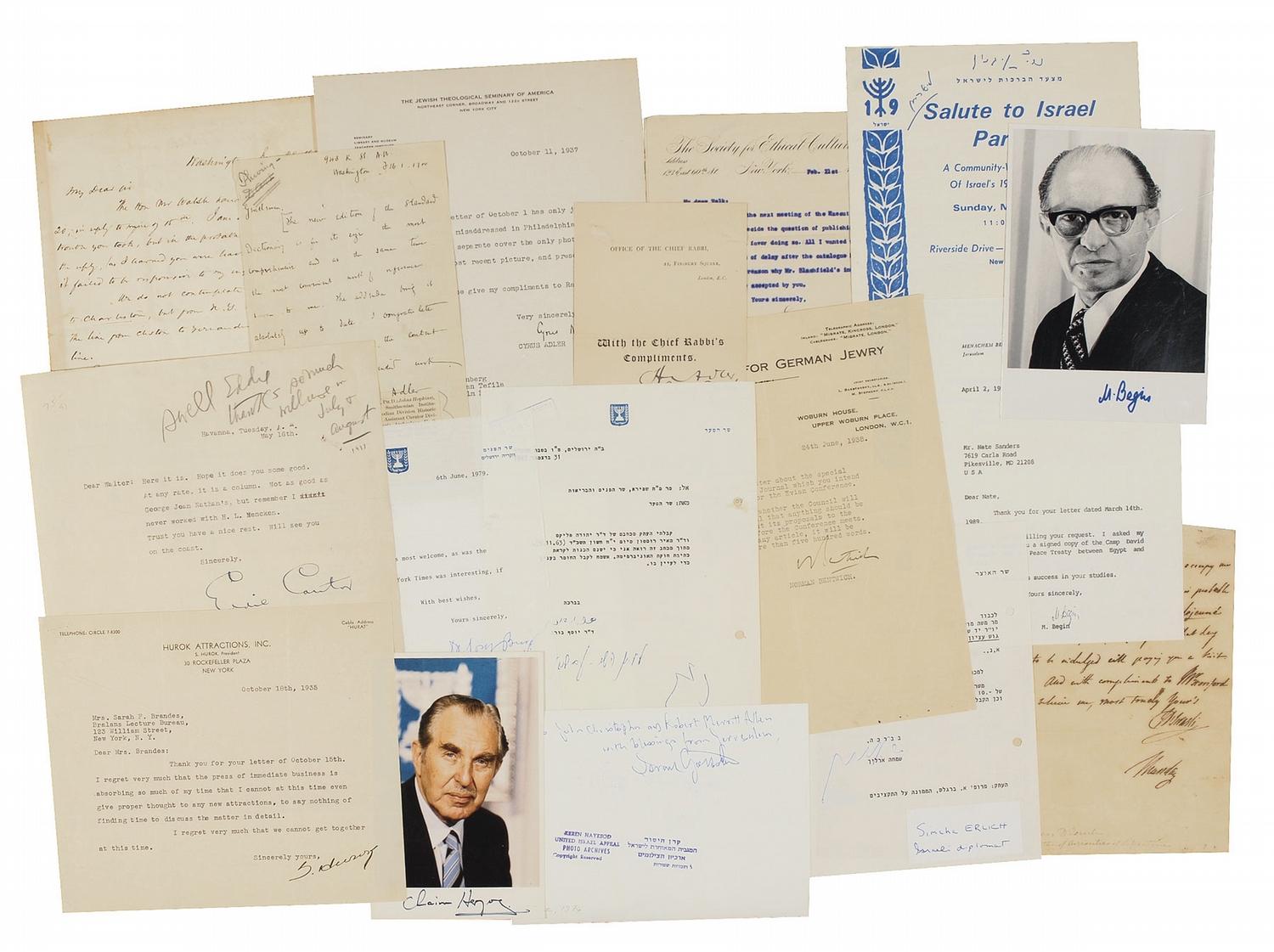 Thirty-three items consisting of mostly one-page ALSs, TLSs, cards, photos, and a program, dating from the 1900s to the 1990s. Includes: four ALSs from Cyrus Adler, David Yulee, Isaac D’Israeli, Max Nordaw; 22 TLSs from Cyrus Adler, Feliz Adler, Menachim Begin, Norman Bentwich, Josef Burg (2), Eddie Cantor, Simcha Erlich, Israel Goldstein, Solomon Hurok, Leone Levi (with postscript), Ludwig Lewisohn, Julian Mack, Jan Pierce, Otto Schiff, Ariel Sharon, George E. Sokolsky, Stephen S. Wise (3), Lucian Wolf, and Haim Zadok; card from Hermann Adler; program from S. Y. Agnon; and five photos from Menachim Begin (2), Israel Goldstein, Chaim Herzog, and Benjamin Netanyahu and Klaus Kinkel. In very good condition to fine condition. An amazing assortment representing nearly 100 years of Judaica and Jewish leaders.