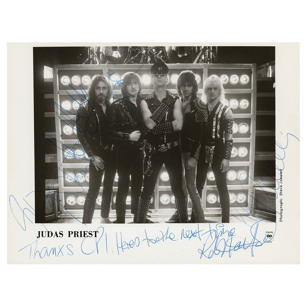Glossy 10 x 8 Columbia Records publicity photo of heavy metal legends Judas Priest, signed and inscribed in blue ballpoint, "Thanxs CPI, Here's to the next time, Rob Halford," "K. K. Downing," "Dave Holland," "Ian Hill," and "Glenn Tipton.†In fine condition.