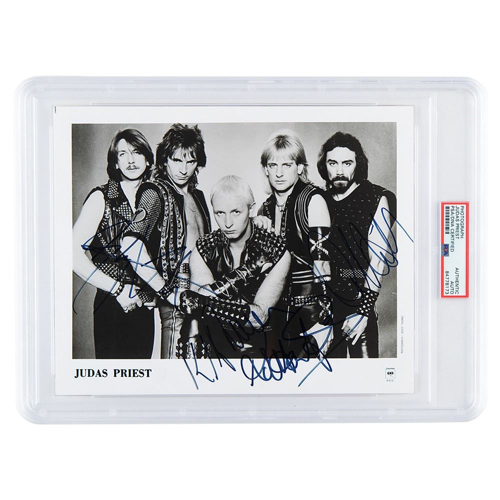 Glossy 10 x 8 Columbia Records publicity photo of heavy metal legends Judas Priest, signed in black felt tip by Rob Halford, K. K. Downing, Ian Hill, and Glenn Tipton. In fine condition. Encapsulated in a PSA/DNA authentication holder.