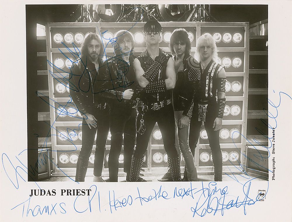 Glossy 10 x 7.75 group photo, signed in blue ballpoint by Ian Hill, K. K. Downing, Dave Holland, Glenn Tipton, and Rob Halford, who inscribes to CPI. In fine condition, with light contrast to a couple of signatures, trimmed top edge, and a few trivial dings.