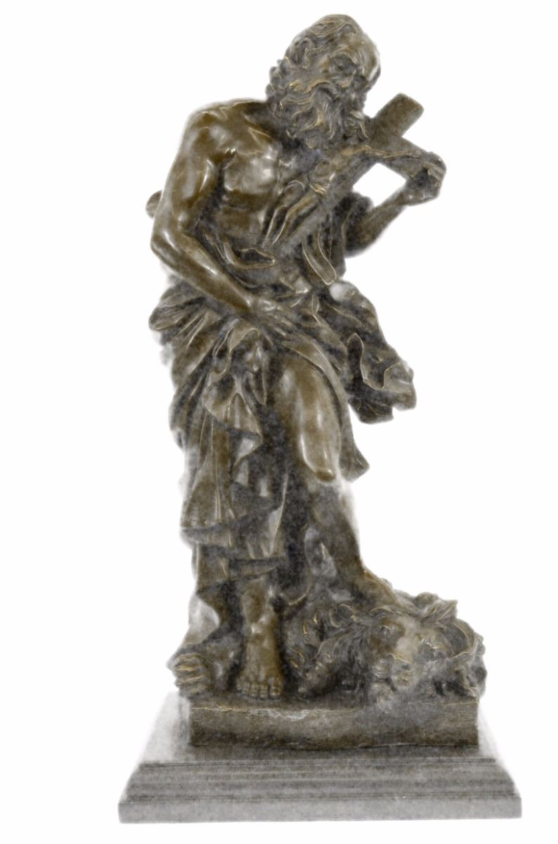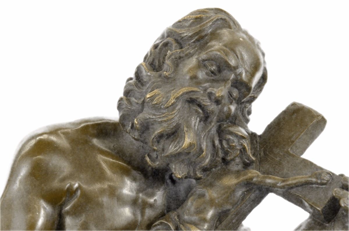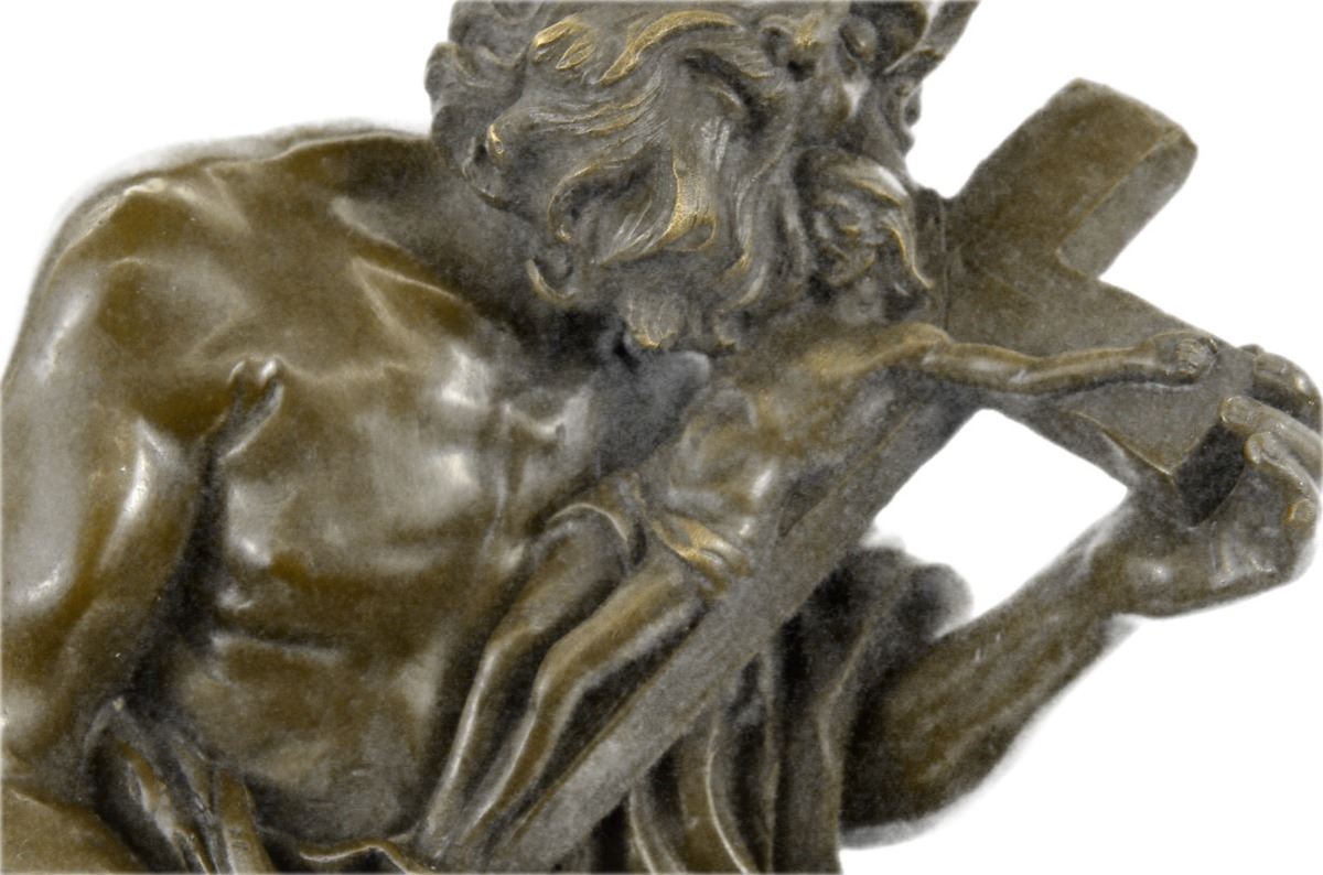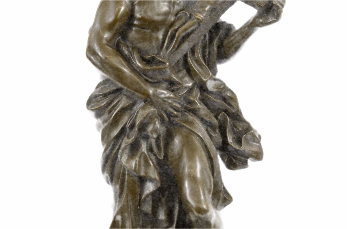 The Bronze Sculpture Contains Multiple Religious Meanings. Here We See Judas Iscariot, Who Was According To The New Testament, One Of The Twelve Disciples Of Jesus. He Is Notoriously Known For His Betrayal Of Jesus To The Hands Of The Chief Priests For 30 Pieces Of Silver. He Seen Walking In Wretchedness, Holding On To Remorse And The Symbol Of Jesus Crucified On The Cross Due To His Betrayal. His Foot Falls Heavy, Crushing The Lion's Head Which Represents Jesus Christ As The Lion From The Tribe Of Judah, Which Stems From The Root Of David And His Lineage. The Handmade Bronze Sculpture Was Cast Using The Archaic Method Of Lost-Wax Casting And Stained With A Brown Patina Finish For Preservation. It Is Mounted Upon A Black Marble Base With The European Bronze Finery Stamp Of Quality. Bronze Dimensions With Marble Base: Height 23 X Width 10 inches. Weight: 32 Lbs.