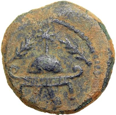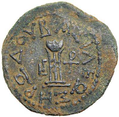 Herod the Great, 40-4 B.C.E. AE 8 Prutot (24mm). Helmet flanked by two palm branches, with star at top. Reverse: Tripod with lebes, standing on podium, with monogram date LG=Year 3 (37 B.C.E.). H-486, AJC 1. The largest coin of Herod. Obverse 20% off-center, reverse is especially sharp and very well centered. Choice Very Fine.