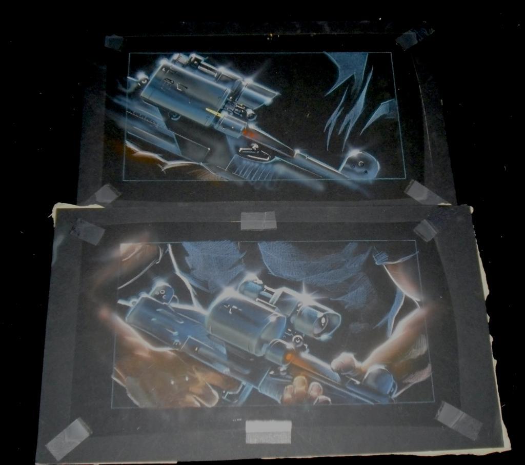 Judge Dredd (1995) - Two original hand drawn concept boards for various prototype weapons. 17" x 10"