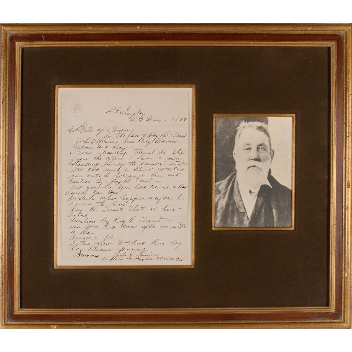 Very rare manuscript DS, one page, 7.5 x 9.5, December 23, 1889. A legal deposition concerning the case of Roy B. Trent who allegedly shot at William Cox. Document reads: “In the case of Roy B. Trent. John C. Monier been duly sworn deposes and says I was standing bout 20 steps from the office. I saw a man standing inside the counter strike Wm. Cox with a stick. Wm. Cox run out. He followed him out.