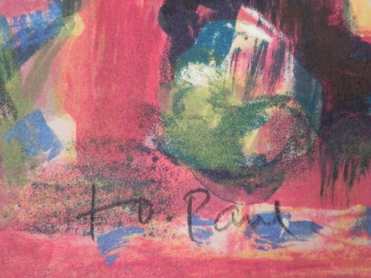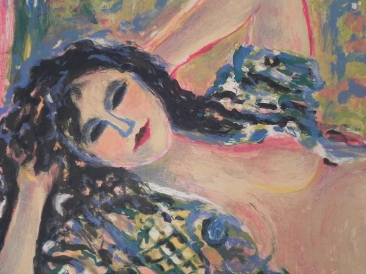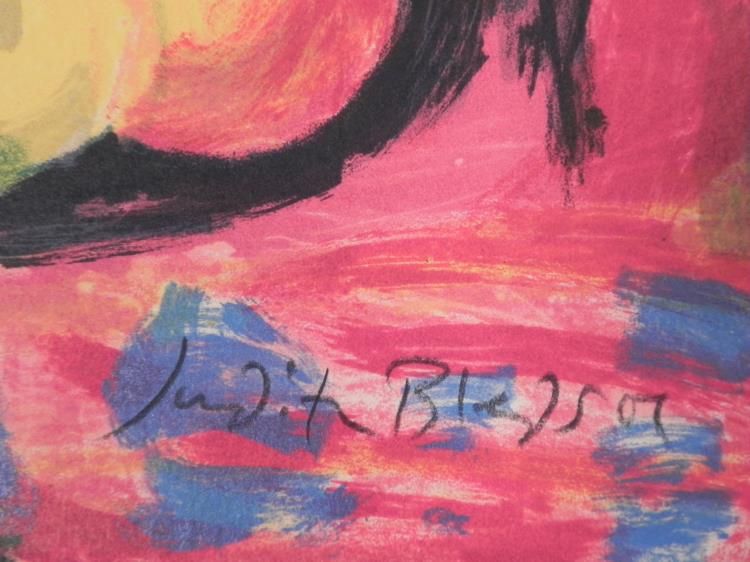 This woman with a casually revealing patterned outfit stands out comfortably in the colorful room. Artist: Judith Bledsoe Signature: "Judith Bledsoe" in pencil, lower right Medium: Lithograph on rag paper Edition: Unnumbered, dedicated artist proof, marked in pencil lower left "For Ron" Other markings: Blind stamp lower left Sheet size: 26 x 31 inches Condition: Excellent Biography: Judith Bledsoe (1928 - 2013) was a free-spirited artist from Hollywood who fled to Europe at age 16, seeking artistic freedom. She settled in Paris, where she was inspired by the art and streets all around her. There she discovered her love of printmaking, and worked for several years at Imprimerie Nationale de France, the official print shop of France. She left to continue painting, her enthusiasm reflecting in her art, and drawing much appreciation from the art world. She participated in numerous group and one woman shows, receiving international awards. Her art can be found in many inspired public and private collections around the world.