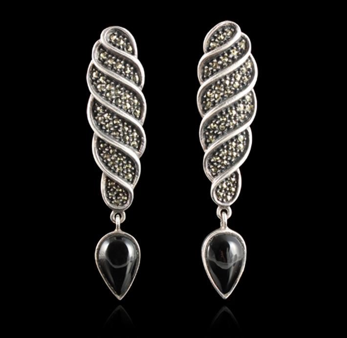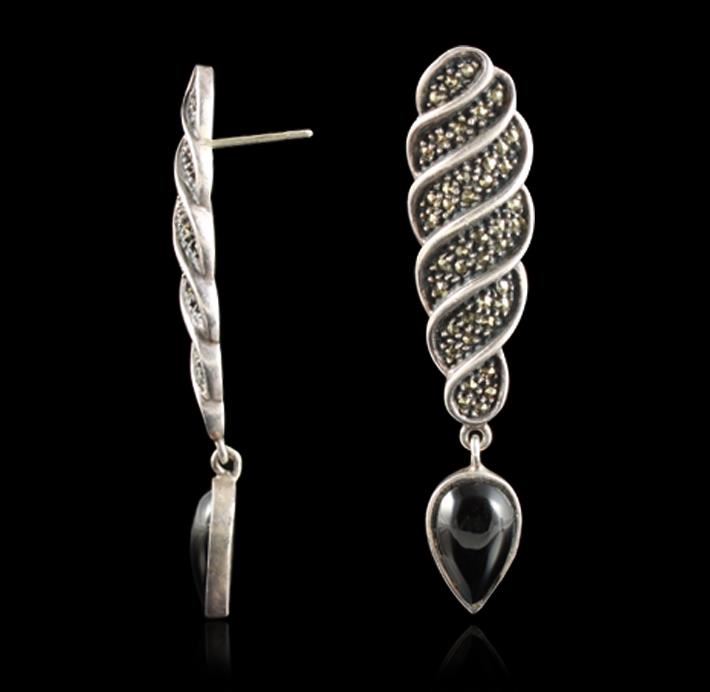 One pair of genuine Judith Jack sterling silver onyx and marcasite dangle teardrop earrings featuring: 14.6 grams of sterling silver. Drop-1 1/2in, Width 5/8 at widest point. Stamped with 925 and Judith jack logo.